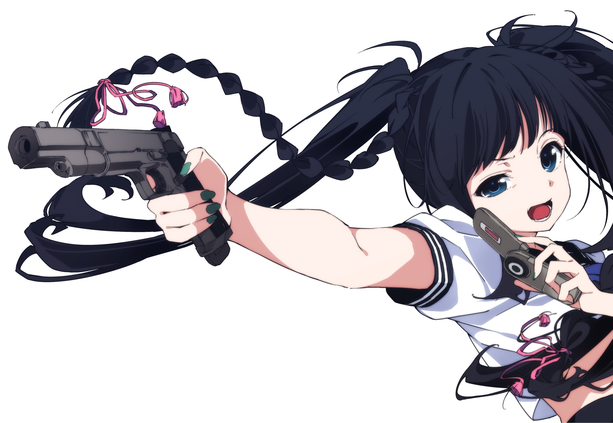 1girl black_hair black_sailor_collar braid cellphone character_request copyright_request flip_phone green_eyes green_nails gun highres holding holding_gun holding_phone holding_weapon insomnia_(insomnia_plus) long_hair nail_polish open_mouth phone sailor_collar school_uniform serafuku shirt short_sleeves simple_background solo twintails upper_body weapon white_background white_shirt