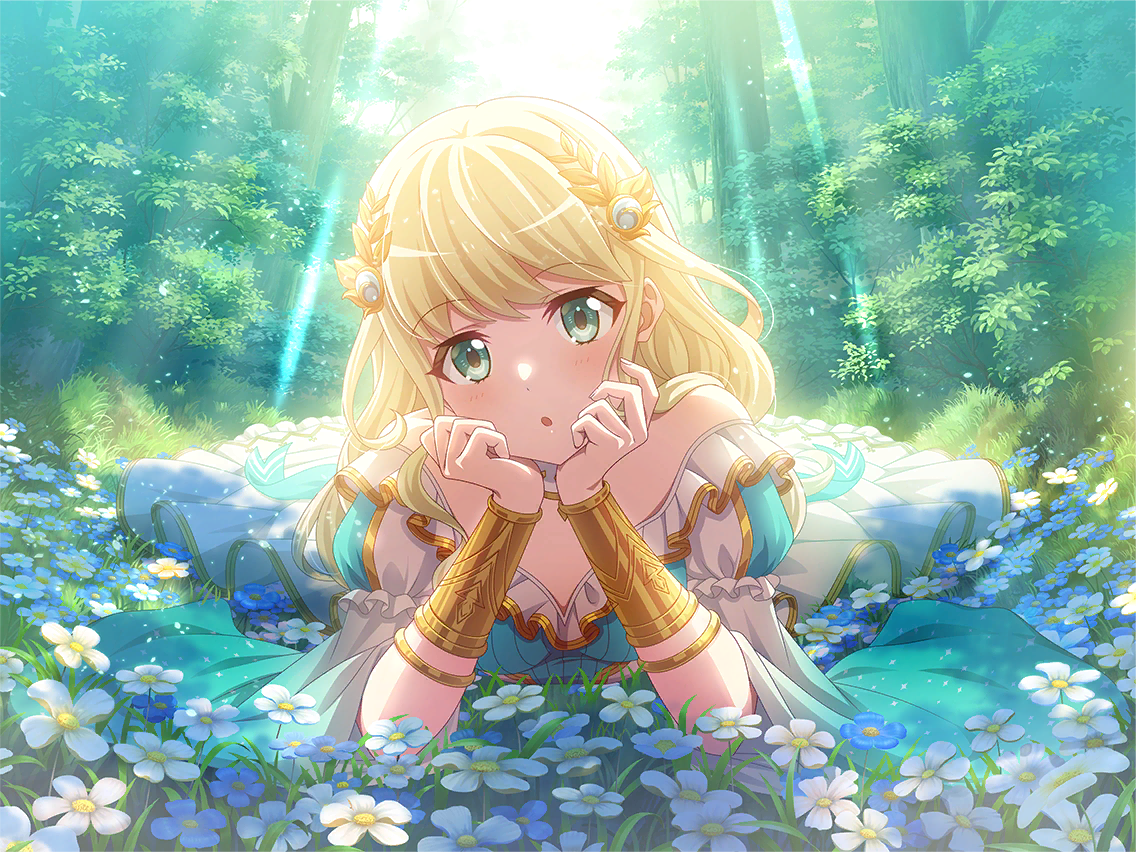 1girl aqua_eyes blonde_hair bracelet bracer dress flower flower_request frilled_dress frills game_cg head_rest headpiece jewelry light_rays long_hair long_sleeves looking_at_viewer lying official_art on_stomach parted_lips puffy_long_sleeves puffy_sleeves shoujo_kageki_revue_starlight shoujo_kageki_revue_starlight_-re_live- solo tree upper_body white_dress yumeoji_shiori