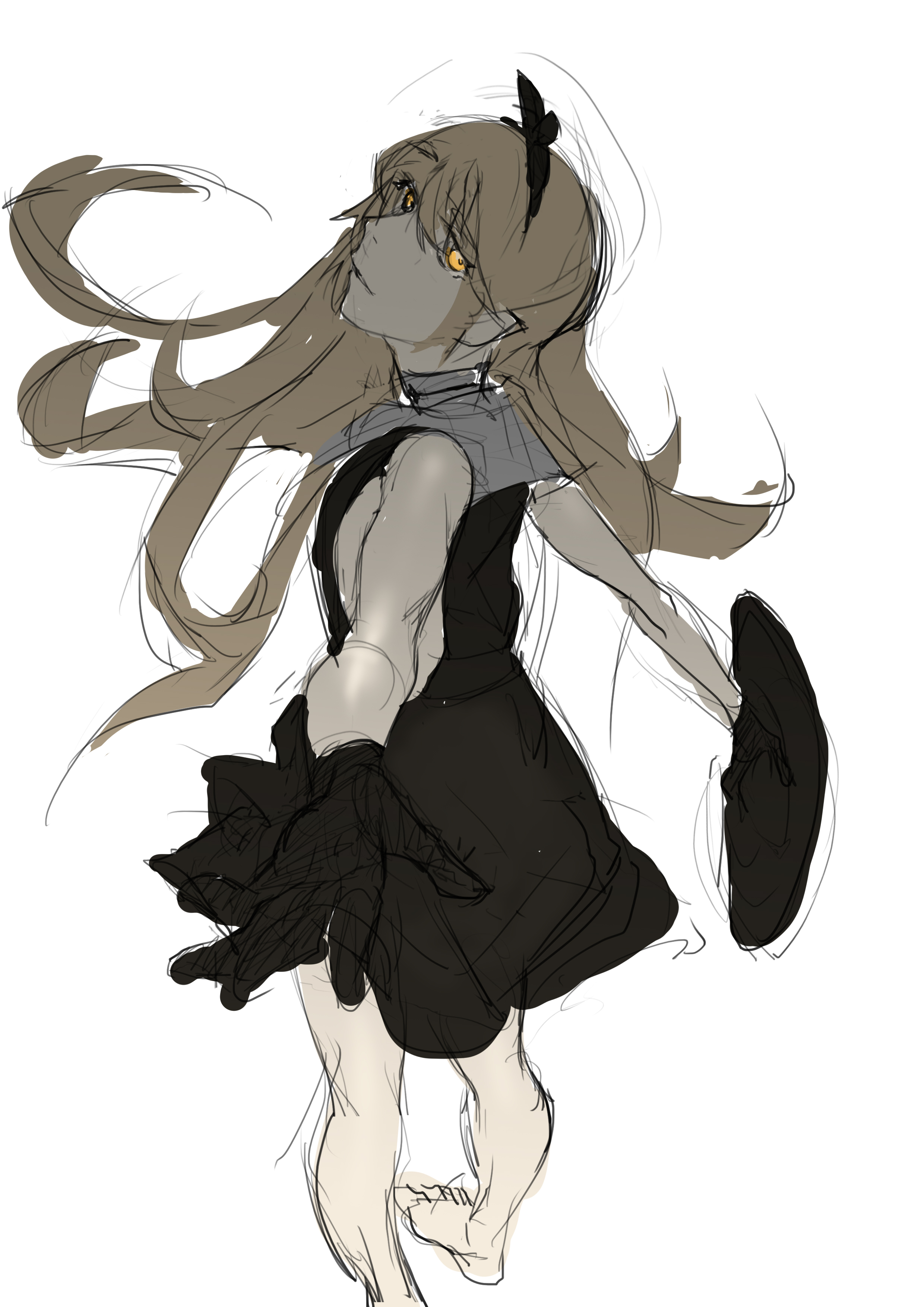 1girl absurdres bare_legs barefoot black_dress black_gloves black_hairband black_hat blonde_hair bow_hairband commentary_request contrast_collar dress expressionless flipped_hair floating_hair foot_out_of_frame from_above from_behind full_body gloves hairband hat highres holding holding_unworn_clothes holding_unworn_hat long_hair looking_at_viewer monogatari_(series) orange_eyes oshino_shinobu outstretched_arms parted_lips pointy_ears puritan_collar reaching reaching_towards_viewer shishirui_san sideless_dress simple_background sketch solo standing unworn_hat unworn_headwear very_long_hair white_background
