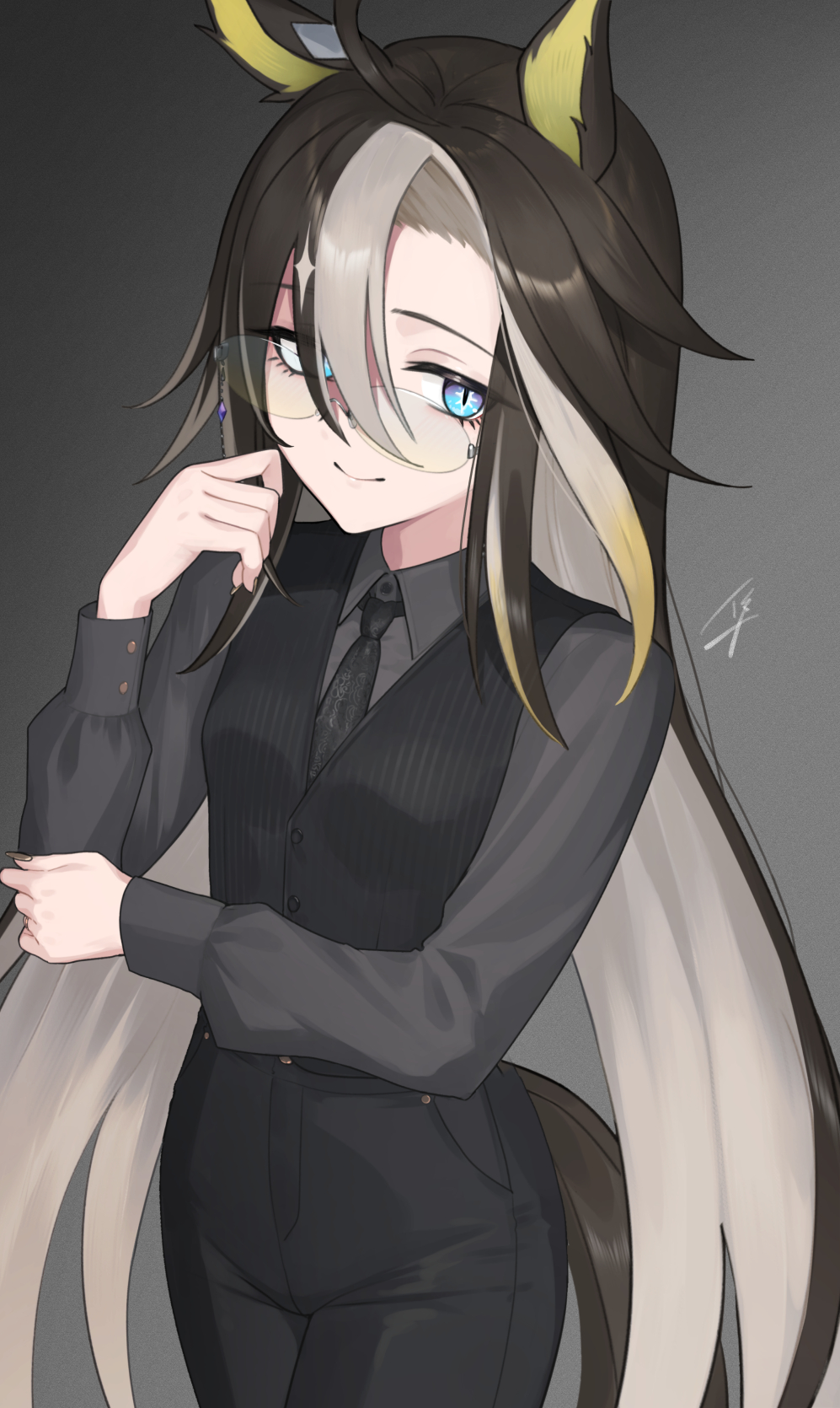 1girl ahoge animal_ears black_hair black_necktie black_pants black_vest blonde_hair blue_eyes closed_mouth collared_shirt colored_inner_hair commentary_request cowboy_shot dream_journey_(umamusume) dress_shirt eyewear_strap glass grey_background grey_shirt hair_between_eyes hand_on_own_elbow hayabusa_(vert_320) highres horse_ears horse_girl horse_tail long_bangs long_hair long_sleeves looking_at_viewer multicolored_hair necktie pants rimless_eyewear shirt smile solo standing tail umamusume very_long_hair vest waistcoat white_hair