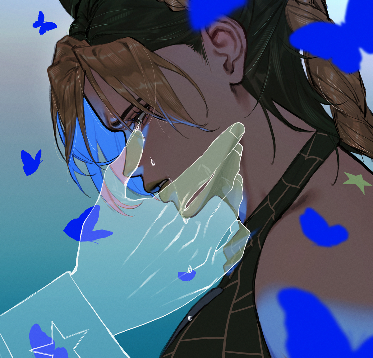 1boy 1girl bare_shoulders black_hair blonde_hair blue_background braid bug butterfly commentary_request crying crying_with_eyes_open from_side gradient_background insect jojo_no_kimyou_na_bouken kuujou_jolyne kuujou_joutarou long_sleeves multicolored_hair parted_lips profile simple_background single_braid stone_ocean tears two-tone_hair upper_body wiping_tears zxor1q0
