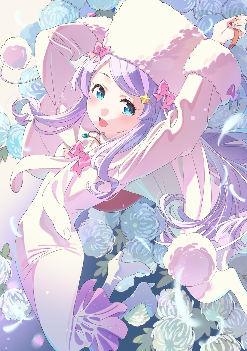 1girl :d anastasia_hoshin arms_up blue_eyes boots bow bowtie cape commentary_request dress fur-trimmed_sleeves fur_hat fur_trim hair_ornament hat high_heel_boots high_heels highres jewelry light_blush long_dress long_hair long_sleeves looking_at_viewer looking_up midair open_mouth papakha pendant pink_bow pink_bowtie pom_pom_(clothes) purple_eyes re:zero_kara_hajimeru_isekai_seikatsu smile solo star_(symbol) star_hair_ornament swept_bangs teeth tokira_nozumi upper_teeth_only white_boots white_cape white_dress white_hat