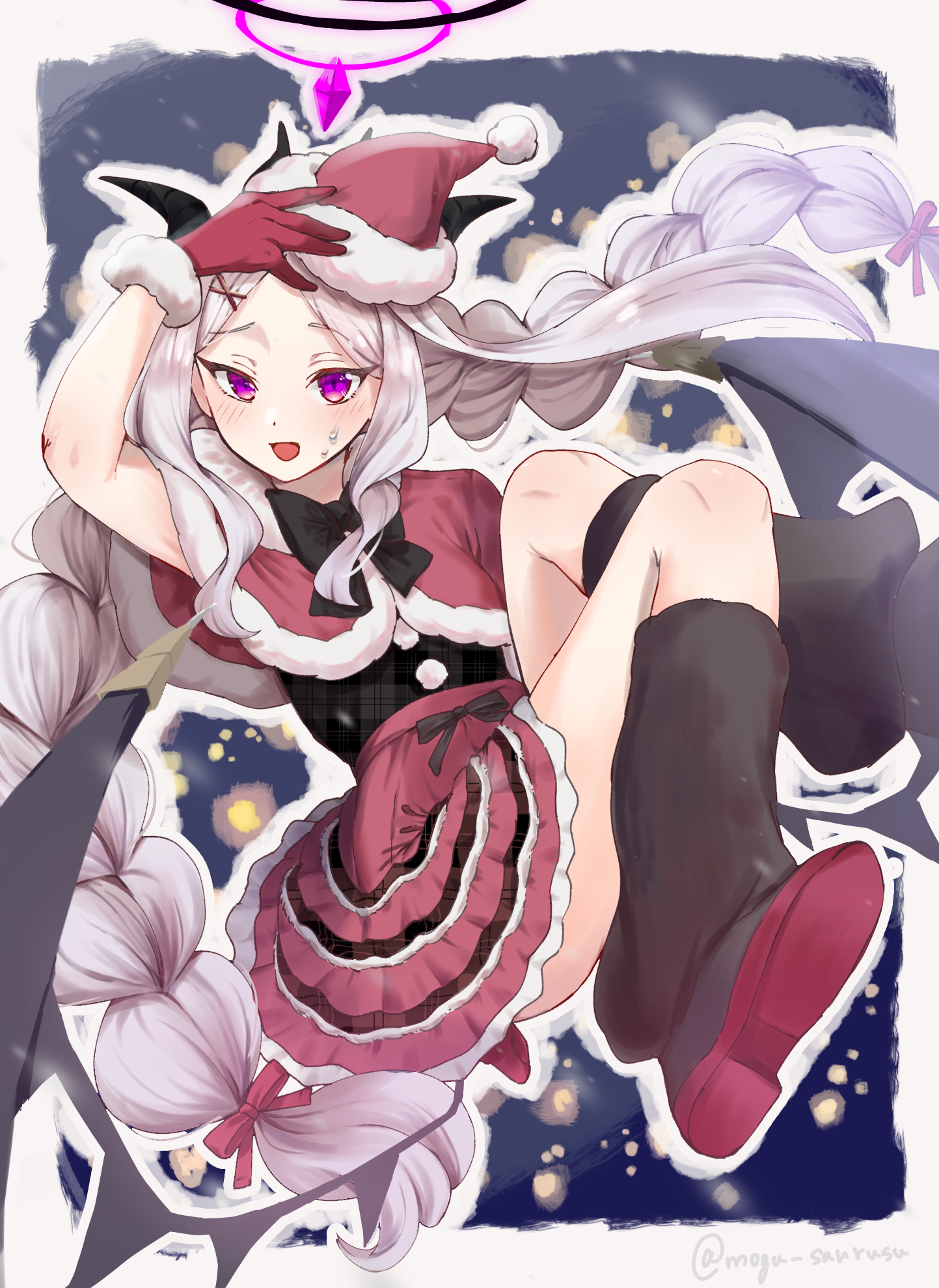 1girl black_halo black_thighhighs blue_archive blush breasts christmas commentary_request demon_girl demon_horns demon_wings halo hat highres hina_(blue_archive) horns long_hair looking_at_viewer low_wings mogu_saurusu open_mouth purple_eyes santa_hat small_breasts solo sweat thighhighs very_long_hair white_hair wings