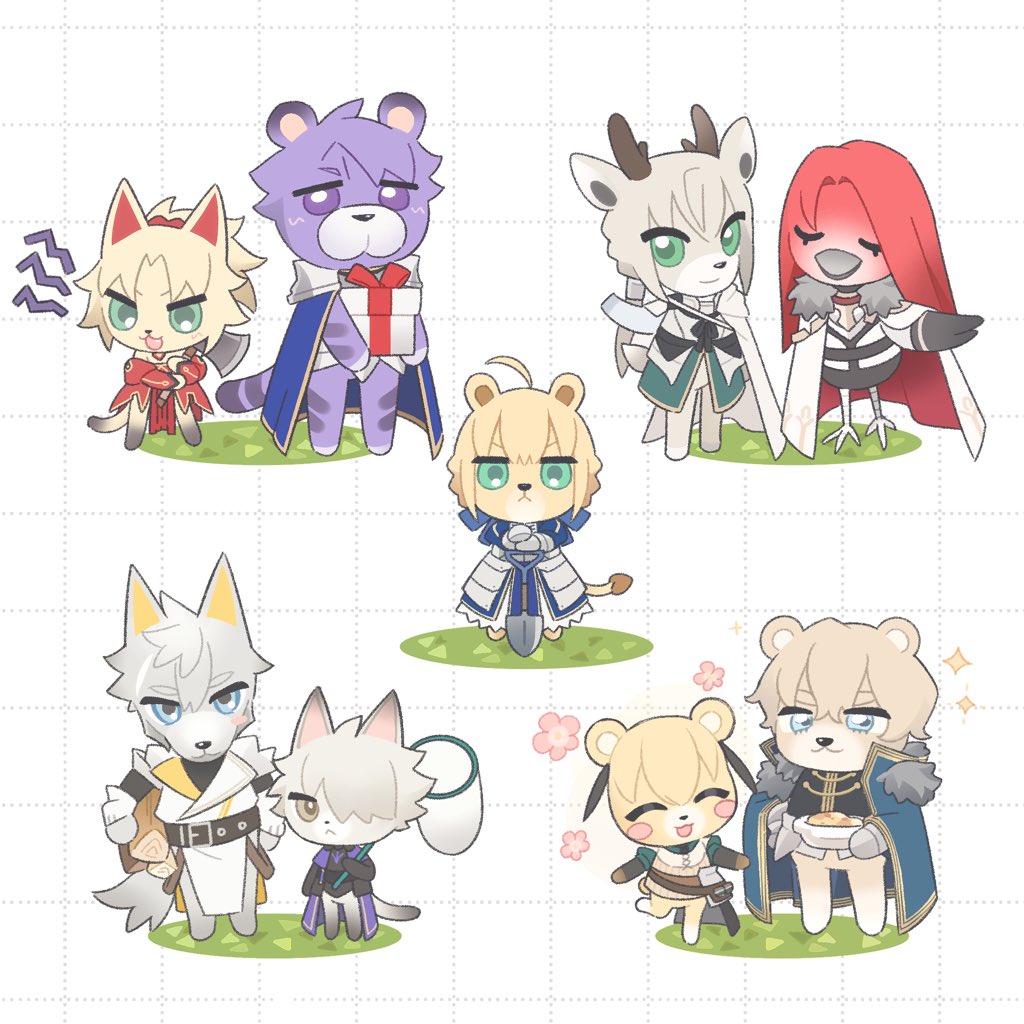 3girls 6+boys animal_crossing animalization armor artoria_pendragon_(fate) axe bedivere_(fate) bird blue_eyes blush_stickers brown_eyes cape cat closed_eyes commentary_request deer fate/grand_order fate_(series) fur-trimmed_cape fur_trim galahad_(fate) gareth_(fate) gawain_(fate) green_eyes grid_background hair_over_one_eye holding holding_axe holding_shovel knights_of_the_round_table_(fate) lancelot_(fate/grand_order) lil1dove lion mordred_(fate) multiple_boys multiple_girls nintendo open_mouth parody percival_(fate) purple_eyes shovel smile tiger tristan_(fate) wolf