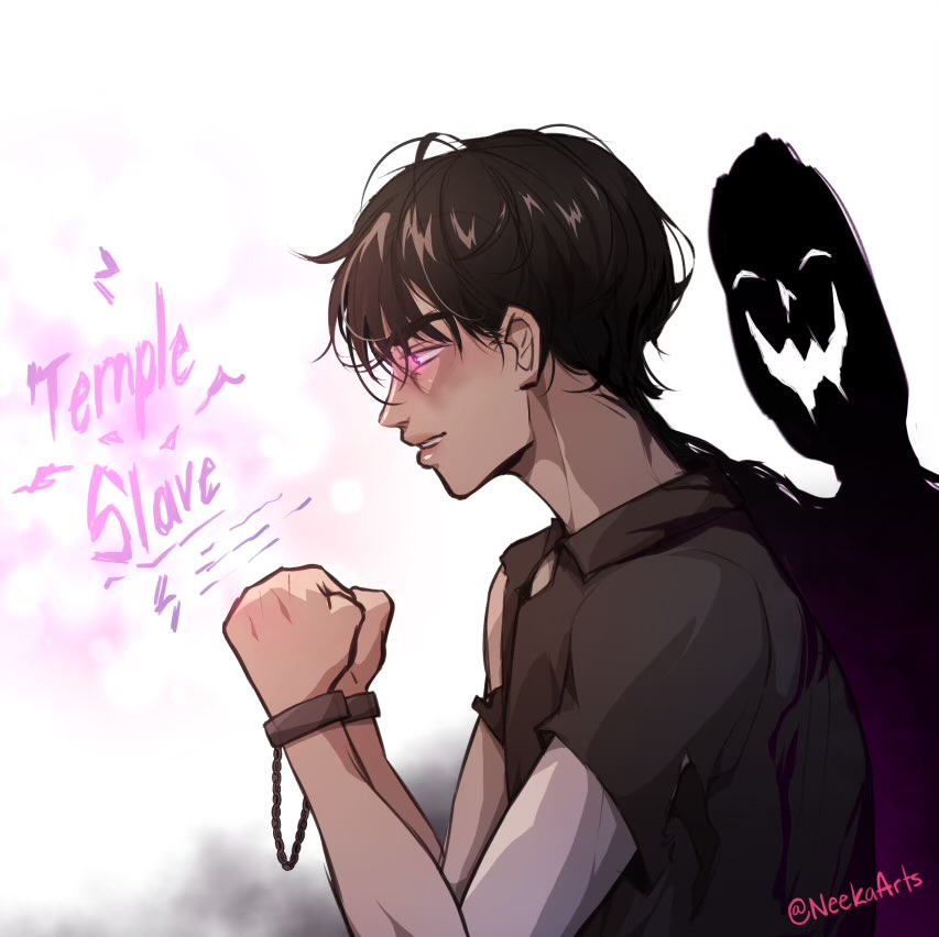 1boy artist_request black_hair black_shirt bound bound_wrists clenched_teeth commentary cuffs different_shadow english_commentary english_text from_side glowing glowing_eyes male_focus parted_lips second-party_source shackles shadow_slave shirt short_hair solo sunny_(shadow_slave) teeth upper_body