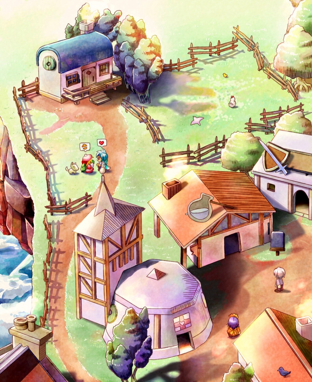 2boys 2girls backpack bad_id bad_pixiv_id bag bird blonde_hair blue_hair chicken dog eijima_moko falcom fence heart highres house landscape light_purple_hair multiple_boys multiple_girls pipiro pipiro_(zwei!!) pockle pockle_(zwei!!) purple_hair randoseru scenery shadow shop sign smoke spoken_heart tree village zwei!! zwei!!_(game)