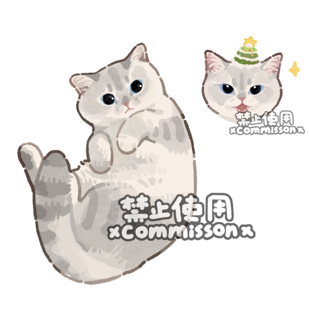 animal animal_focus blue_eyes cat christmas christmas_tree commission cropped_head full_body grey_cat looking_at_viewer lying multiple_views no_humans open_mouth original simple_background tabby_cat watermark white_background xiao_bo_kuai_kuai