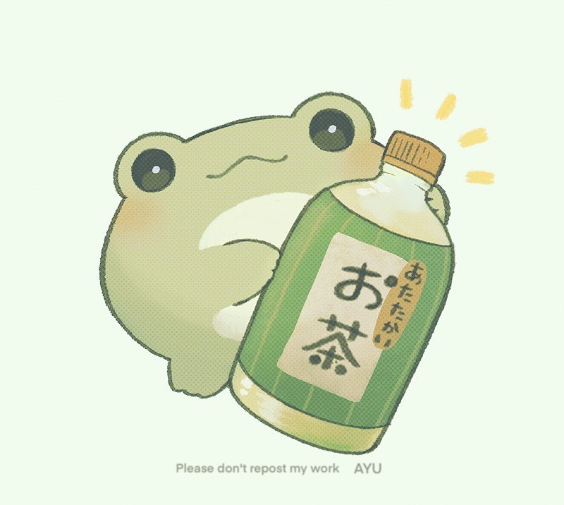 :3 animal animal_focus artist_name ayu_(mog) bottle bright_pupils closed_mouth commentary commentary_request english_commentary frog holding holding_bottle mixed-language_commentary no_humans notice_lines original romaji_commentary simple_background smile translated watermark white_background white_pupils