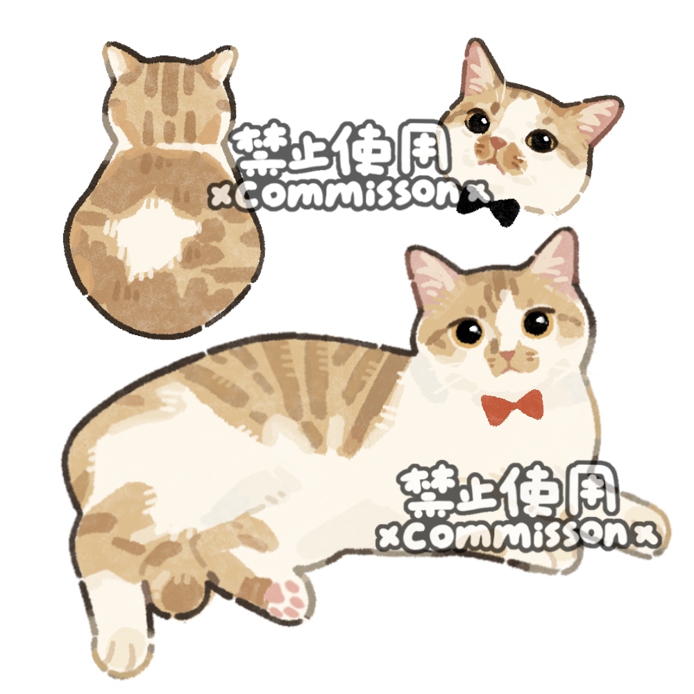 animal animal_focus black_bow black_bowtie bow bowtie cat chick-fil-a_sauce_cat_(meme) commission cropped_head from_above full_body looking_at_viewer lying meme multiple_views no_humans on_side original pawpads red_bow red_bowtie simple_background solo_focus tabby_cat watermark white_background xiao_bo_kuai_kuai yellow_cat yellow_eyes
