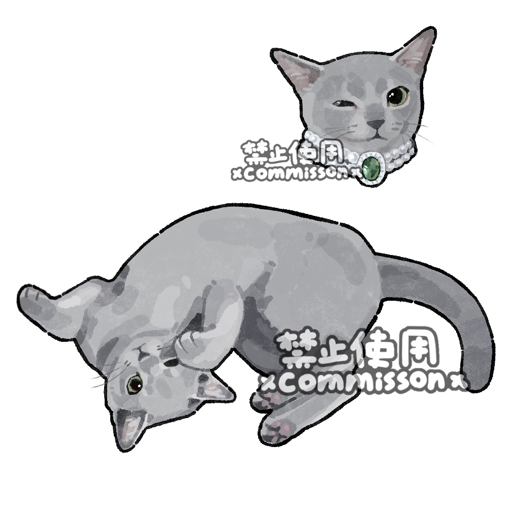 animal animal_focus cat commission cropped_head full_body gem green_eyes green_gem grey_cat jewelry looking_at_viewer lying multiple_views necklace no_humans on_back original pawpads pearl_necklace russian_blue_cat simple_background solo_focus watermark white_background xiao_bo_kuai_kuai