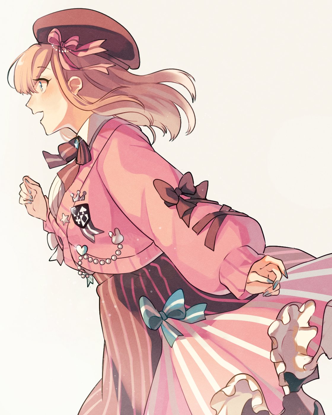 1girl beret blonde_hair blue_eyes blue_nails blush bow bowtie breasts brown_bow brown_bowtie brown_hat brown_skirt cardigan commentary_request cowboy_shot cross-laced_clothes cross-laced_sleeves floating_hair frilled_skirt frills from_side grey_background hand_up hat hat_bow highres long_hair long_sleeves looking_ahead medium_breasts medium_skirt nail_polish nijisanji open_mouth pink_bow pink_cardigan pink_skirt profile puffy_long_sleeves puffy_sleeves shimogami_mayoko simple_background skirt sleeves_past_wrists smile solo striped_clothes striped_skirt suzuhara_lulu suzuhara_lulu_(1st_costume) vertical-striped_clothes vertical-striped_skirt virtual_youtuber