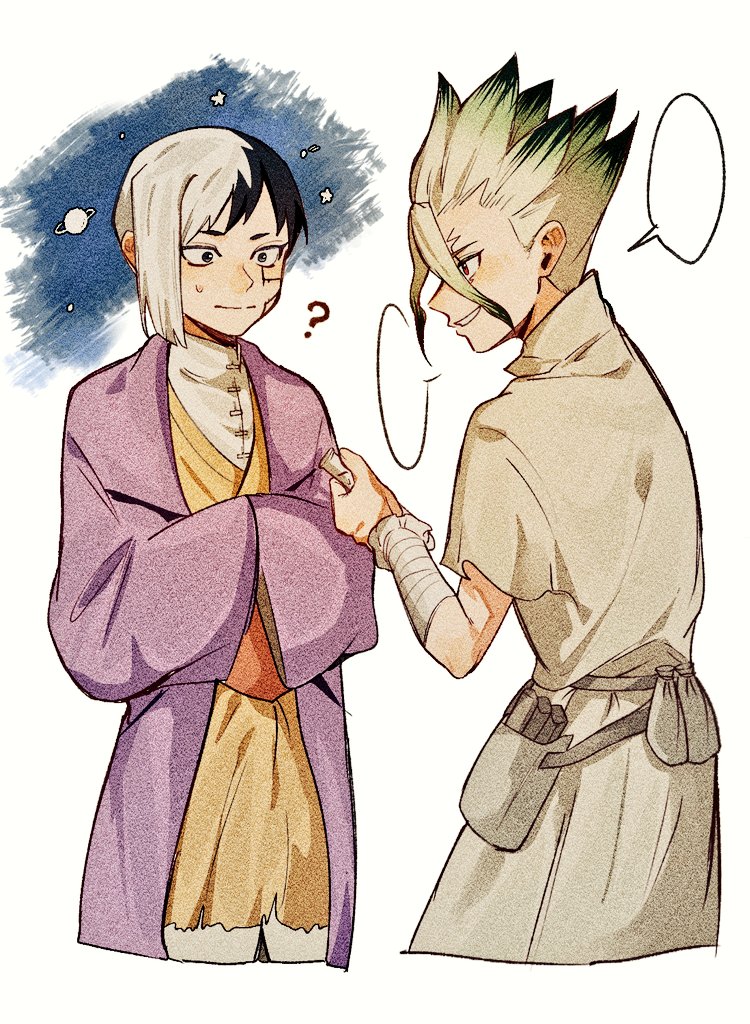 0a_9_(pixiv82791714) 2boys ? asagiri_gen asymmetrical_hair bandaged_arm bandages black_hair colored_bangs dr._stone facial_mark green_hair hands_in_opposite_sleeves holding implied_yaoi ishigami_senkuu japanese_clothes kimono long_sleeves looking_at_another male_focus multicolored_hair multiple_boys pink_kimono pouch robe short_hair sleeves_past_fingers sleeves_past_wrists smile speech_bubble spiked_hair split-color_hair sweatdrop two-tone_hair white_background white_hair