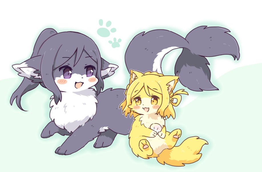 2girls :3 animal_focus animalization blonde_hair blush_stickers cat cetacean_tail commentary_request fins fish_tail full_body grey_fur grey_hair hair_rings love_live! love_live!_sunshine!! matsuura_kanan multiple_girls nako_(user_wnnm5534) no_humans ohara_mari open_mouth ponytail purple_eyes single_hair_ring tail yellow_eyes yellow_fur
