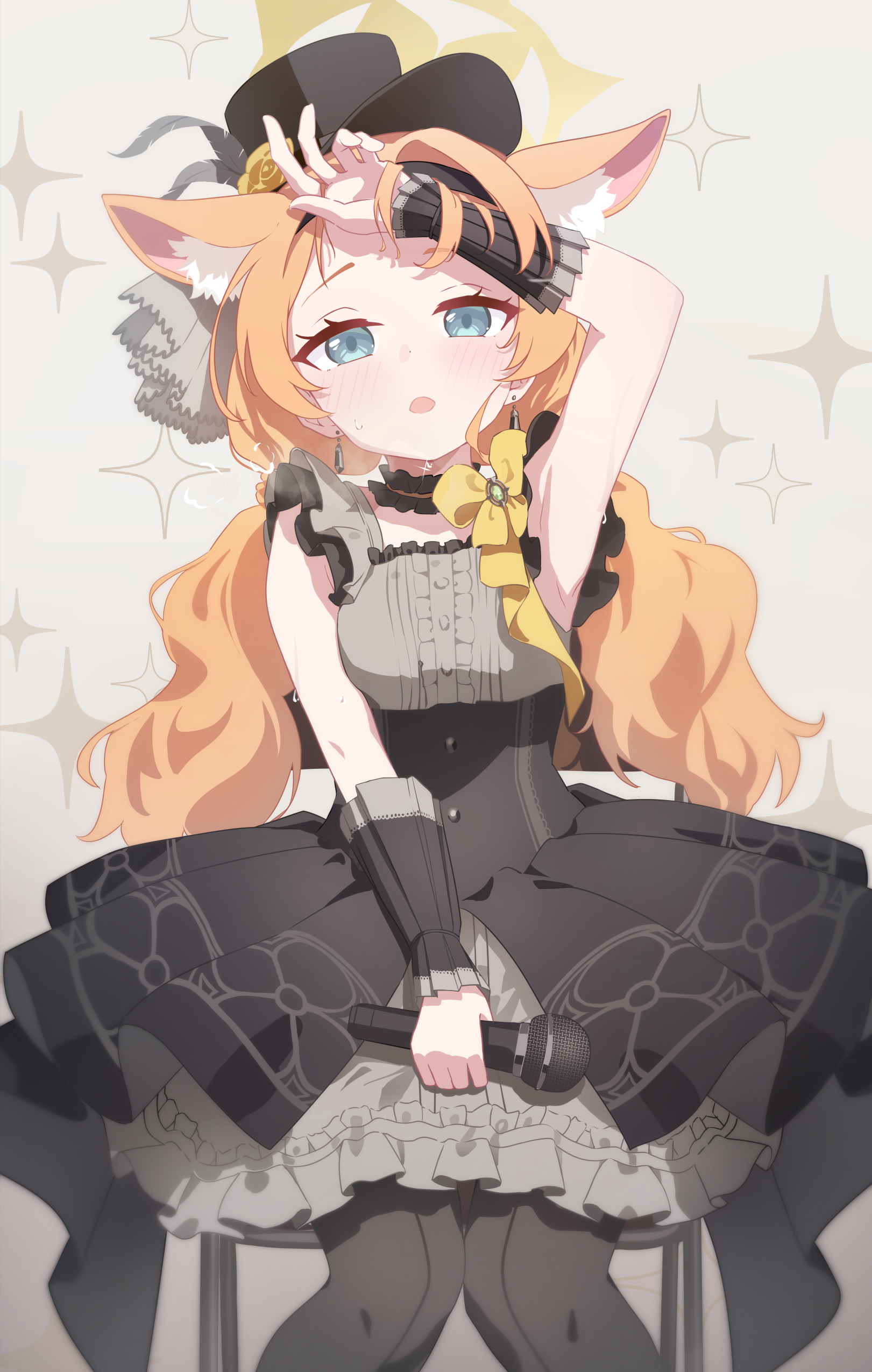 1girl absurdres animal_ear_fluff animal_ears arm_up armpits black_hat black_pantyhose black_skirt blue_archive breasts cat_ears center_frills commentary_request feet_out_of_frame frills gaaratelier grey_background grey_eyes grey_shirt halo hat highres holding holding_microphone knees_together_feet_apart long_hair looking_at_viewer mari_(blue_archive) mari_(idol)_(blue_archive) microphone orange_hair pantyhose parted_lips shirt simple_background sitting skirt small_breasts solo sparkle sweat very_long_hair