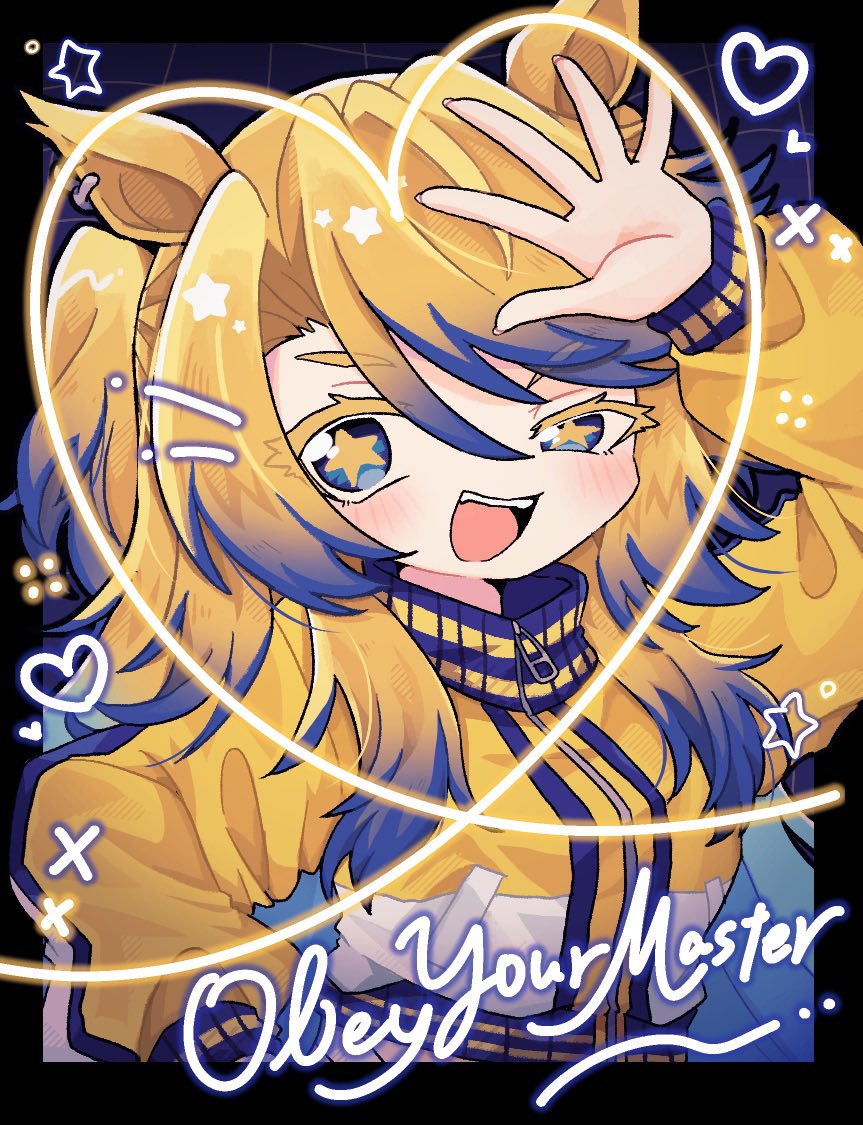 1girl animal_ears blonde_hair blue_eyes blue_hair blush breasts commentary_request heart horse_ears horse_girl jacket jewelry long_hair long_sleeves looking_at_viewer mch_m0n0 multicolored_hair obey_your_master_(umamusume) open_mouth smile solo star-shaped_pupils star_(symbol) symbol-shaped_pupils teeth two-tone_hair umamusume umamusume:_cinderella_gray upper_body upper_teeth_only yellow_jacket