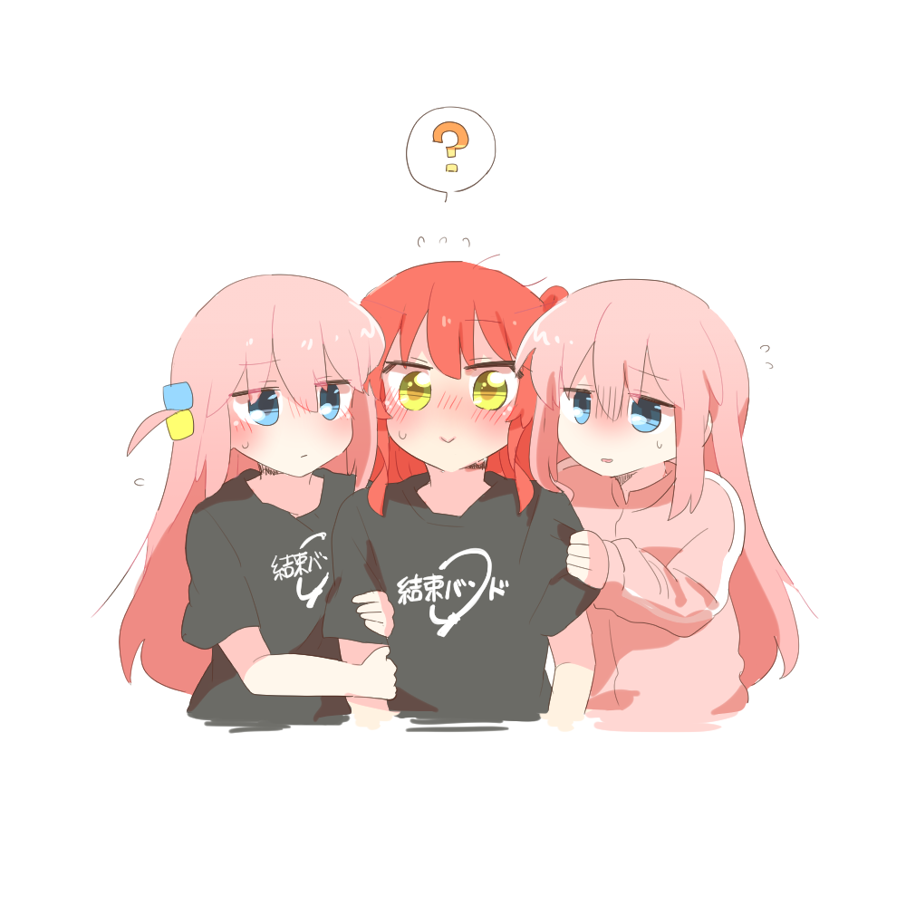 3girls ? black_shirt blue_eyes blush bocchi_the_rock! clone closed_mouth commentary_request cropped_torso cube_hair_ornament flying_sweatdrops gotoh_hitori hair_between_eyes hair_ornament jacket kessoku_band_t-shirt kita_ikuyo long_hair long_sleeves multiple_girls nose_blush one_side_up parted_lips pink_hair pink_jacket rebecca_(keinelove) red_hair shirt short_sleeves simple_background smile spoken_question_mark t-shirt track_jacket white_background yellow_eyes