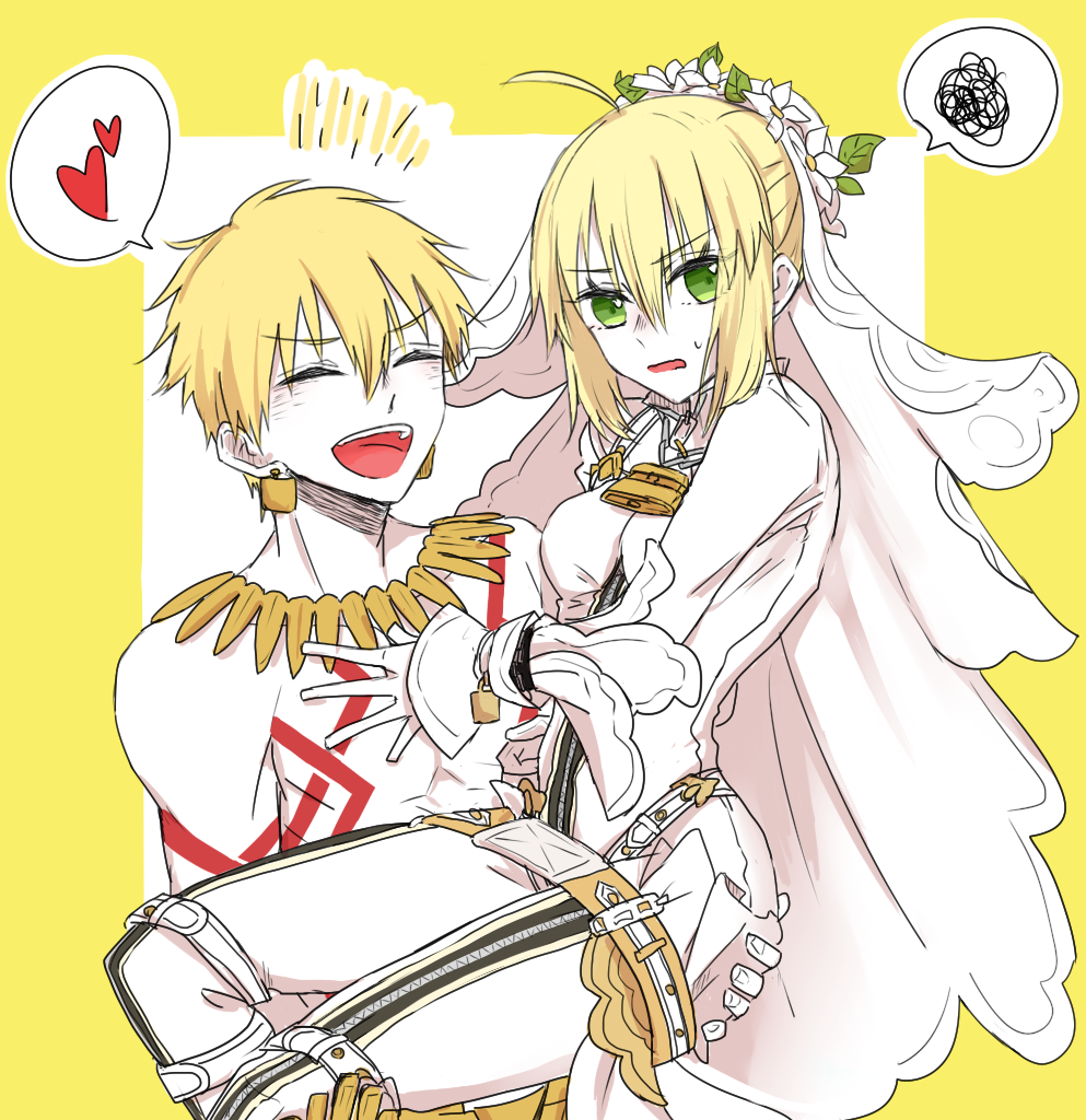 1boy 1girl armor belt blaulilie110 blonde_hair bodysuit breastplate breasts carrying carrying_person commentary_request earrings fate/extra fate/extra_ccc fate_(series) gilgamesh_(fate) green_eyes heart jewelry lock medium_breasts necklace nero_claudius_(bride)_(fate) nero_claudius_(fate) open_mouth padlock sleeves_past_wrists smile spoken_heart spoken_squiggle squiggle sweatdrop topless_male veil white_bodysuit white_veil yellow_belt zipper