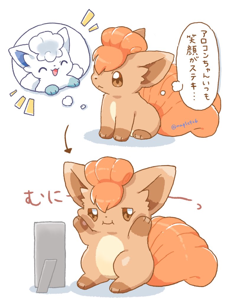 alolan_form alolan_vulpix animal_focus brown_eyes brown_fur closed_eyes closed_mouth commentary_request fox gen_1_pokemon gen_7_pokemon kana_(maple926) mirror multiple_tails nintendo no_humans open_mouth pokemon pokemon_(creature) pokemon_focus red_fur regional_and_normal smile speech_bubble tail thought_bubble vulpix white_fur