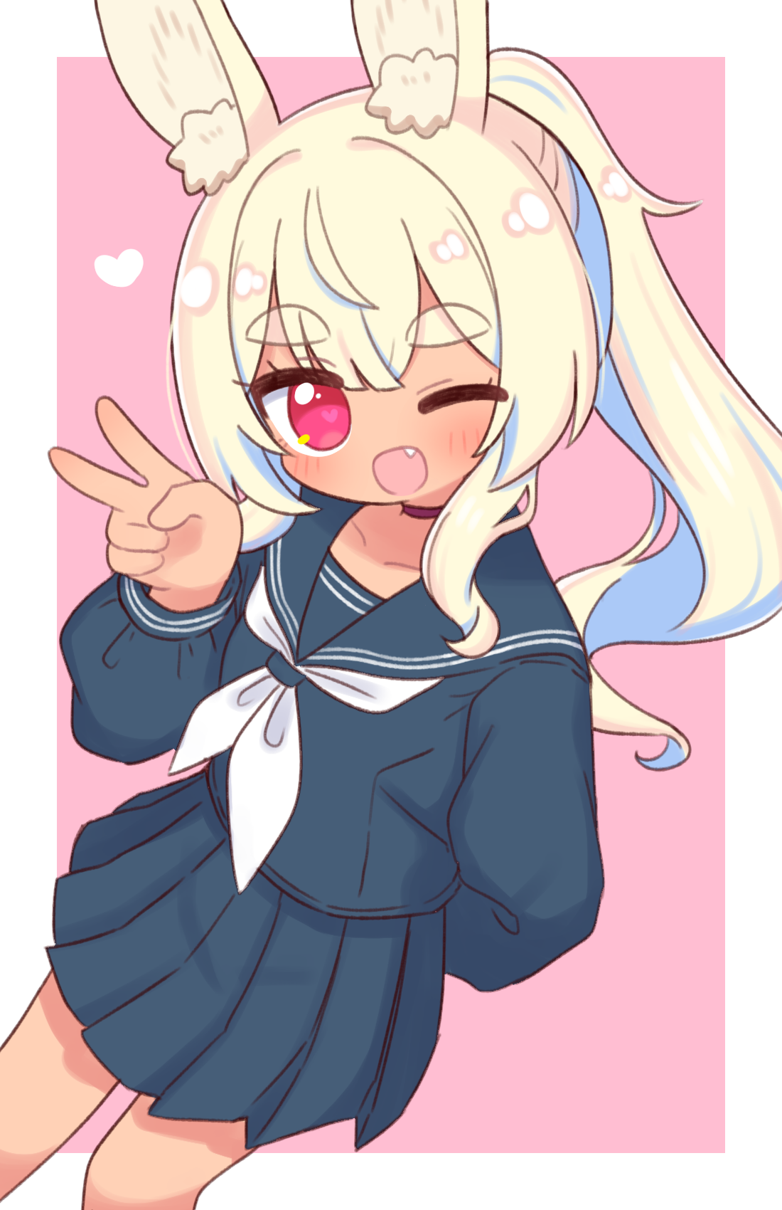 1girl ;d animal_ear_fluff animal_ears arm_behind_back blonde_hair blue_hair blue_sailor_collar blue_serafuku blue_shirt blue_skirt border choker collarbone cowboy_shot etrian_odyssey fang hand_up heart heart-shaped_pupils highres long_hair long_sleeves looking_at_viewer masurao_(sekaiju) masurao_2_(sekaiju) miniskirt multicolored_hair naga_u neckerchief one_eye_closed open_mouth outside_border pink_background pink_eyes pleated_skirt ponytail puffy_long_sleeves puffy_sleeves purple_choker rabbit_ears rabbit_girl sailor_collar sailor_shirt school_uniform sekaiju_no_meikyuu sekaiju_no_meikyuu_5 serafuku shirt skirt smile solo streaked_hair symbol-shaped_pupils thick_eyebrows two-tone_hair v white_border white_neckerchief