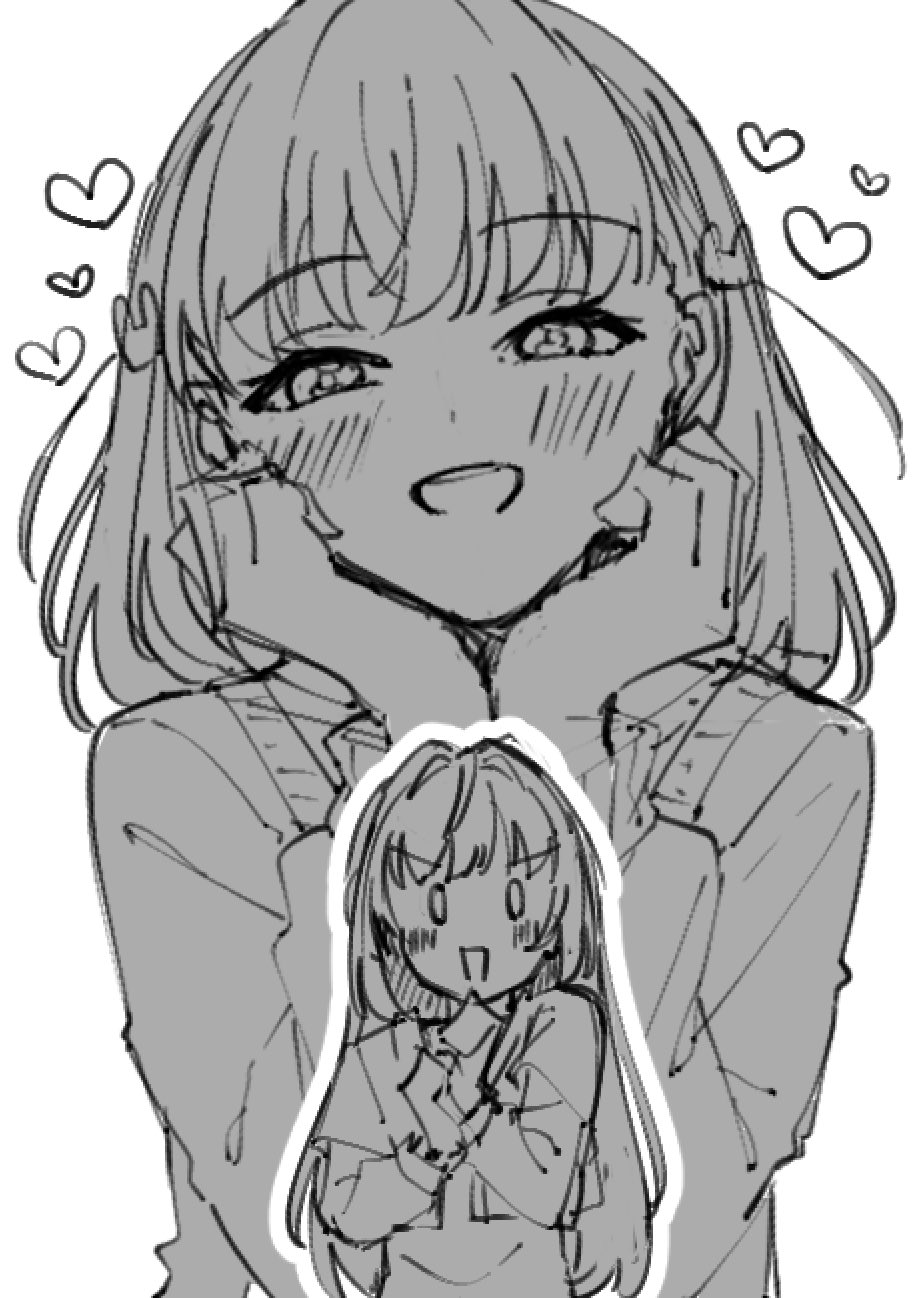 0_0 2girls :d blush cardigan commentary cropped_cardigan doujinshi_cover_trope_(trend) greyscale hair_ornament half-closed_eyes heart highres hinoshita_kaho hinoshita_kaho_(winter_loungewear) link!_like!_love_live! liz_(piyoko_piyop) long_sleeves love_live! medium_hair monochrome multiple_girls open_cardigan open_clothes open_mouth otomune_kozue otomune_kozue_(winter_loungewear) rabbit_hair_ornament simple_background smile two_side_up unfinished v-shaped_eyebrows virtual_youtuber white_background