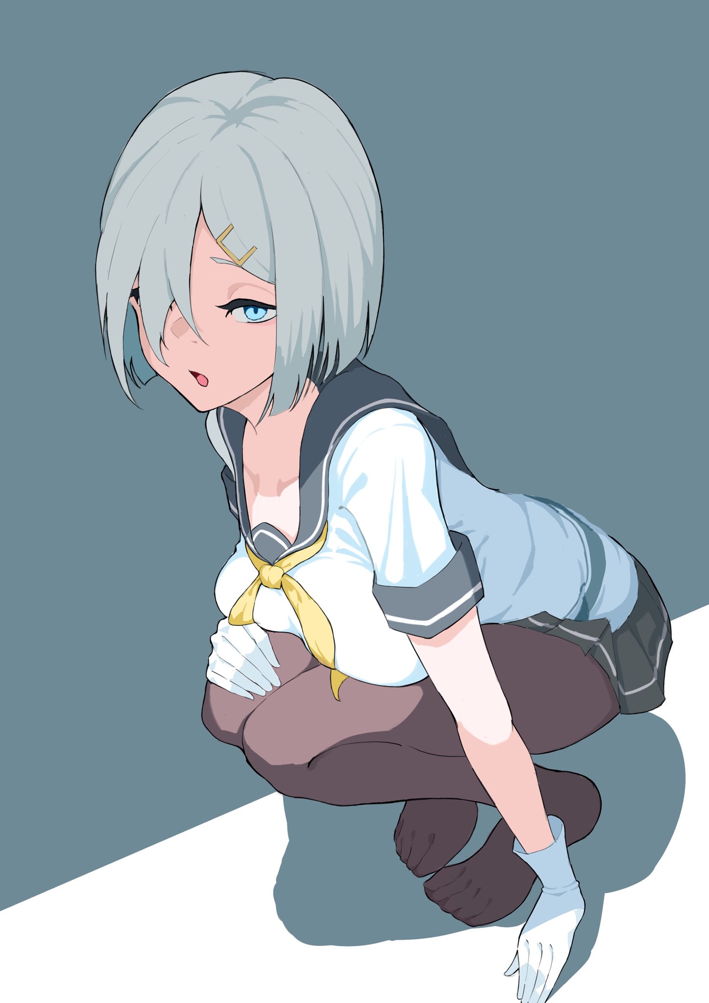 1girl blue_eyes blush breast_press breasts brown_pantyhose commentary_request fish_can_8 gloves grey_background grey_hair grey_sailor_collar grey_skirt hair_ornament hair_over_one_eye hairclip hamakaze_(kancolle) highres kantai_collection large_breasts looking_at_viewer neckerchief open_mouth pantyhose pleated_skirt sailor_collar school_uniform serafuku short_hair short_sleeves skirt solo squatting white_gloves yellow_neckerchief