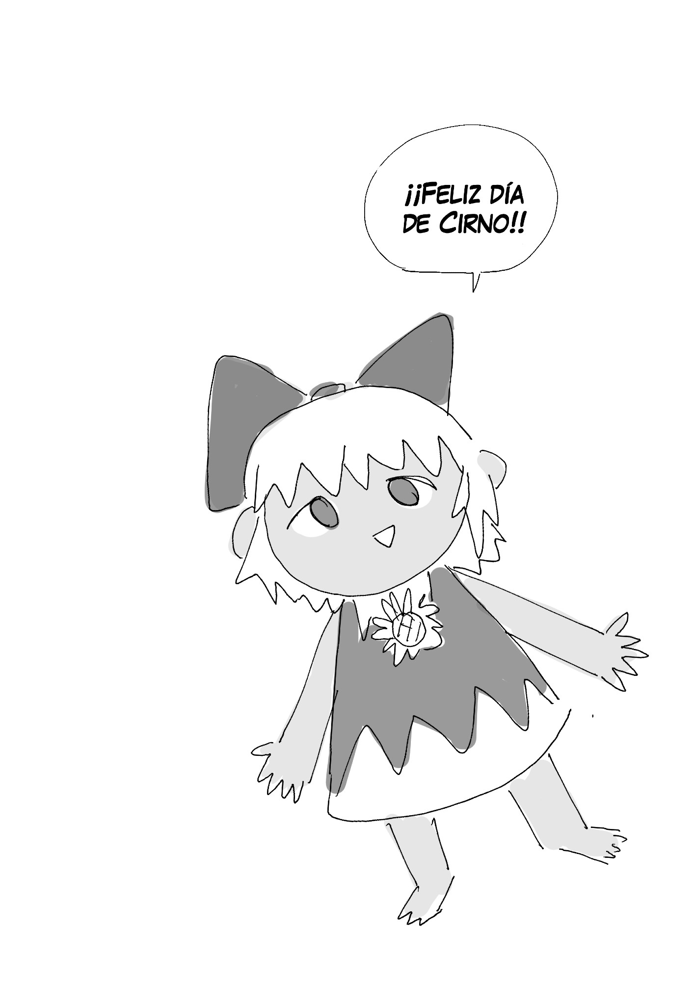 bow child's_drawing cirno commentary english_commentary greyscale hair_bow highres manganart monochrome simple_background spanish_text touhou