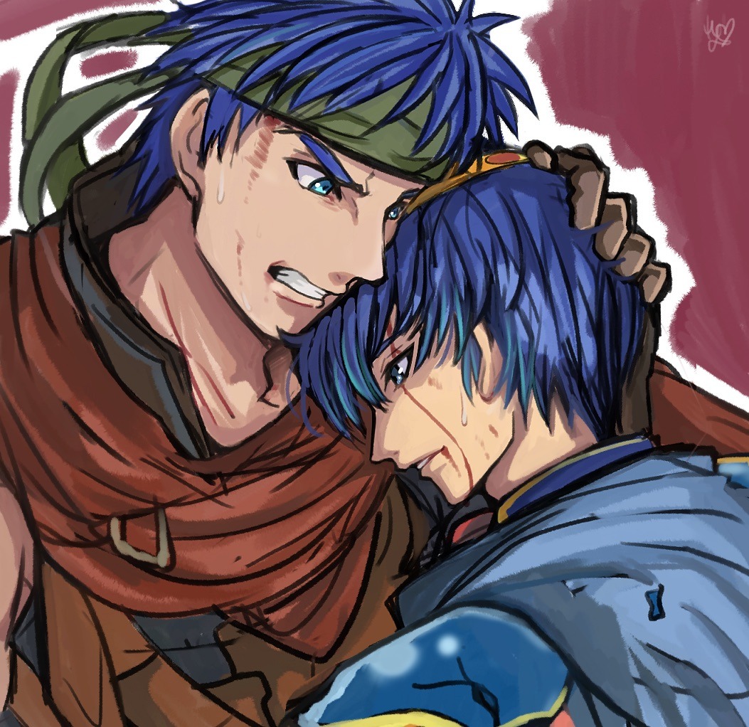 2boys blood blood_on_face blue_eyes blue_hair clenched_teeth commentary_request fire_emblem fire_emblem:_mystery_of_the_emblem fire_emblem:_radiant_dawn green_headband hand_on_another's_head headband ike_(fire_emblem) male_focus marth_(fire_emblem) multiple_boys nintendo rem_(eyes_410) short_hair teeth tiara