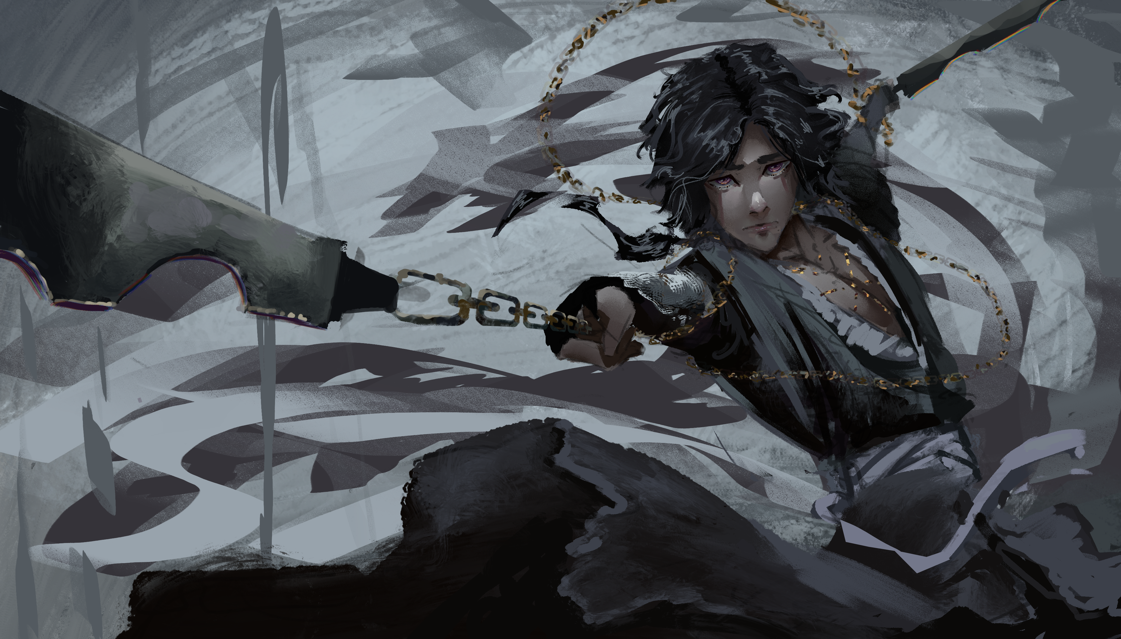 1boy absurdres bad_link black_gloves black_hair black_tunic chain commentary commission dagger english_commentary fingerless_gloves gloves gold_chain highres holding holding_chain holding_dagger holding_knife holding_weapon ignoramoose knife looking_at_viewer male_focus original outstretched_arms pectoral_cleavage pectorals red_eyes second-party_source serious shadow_slave short_hair solo tunic waistband weapon