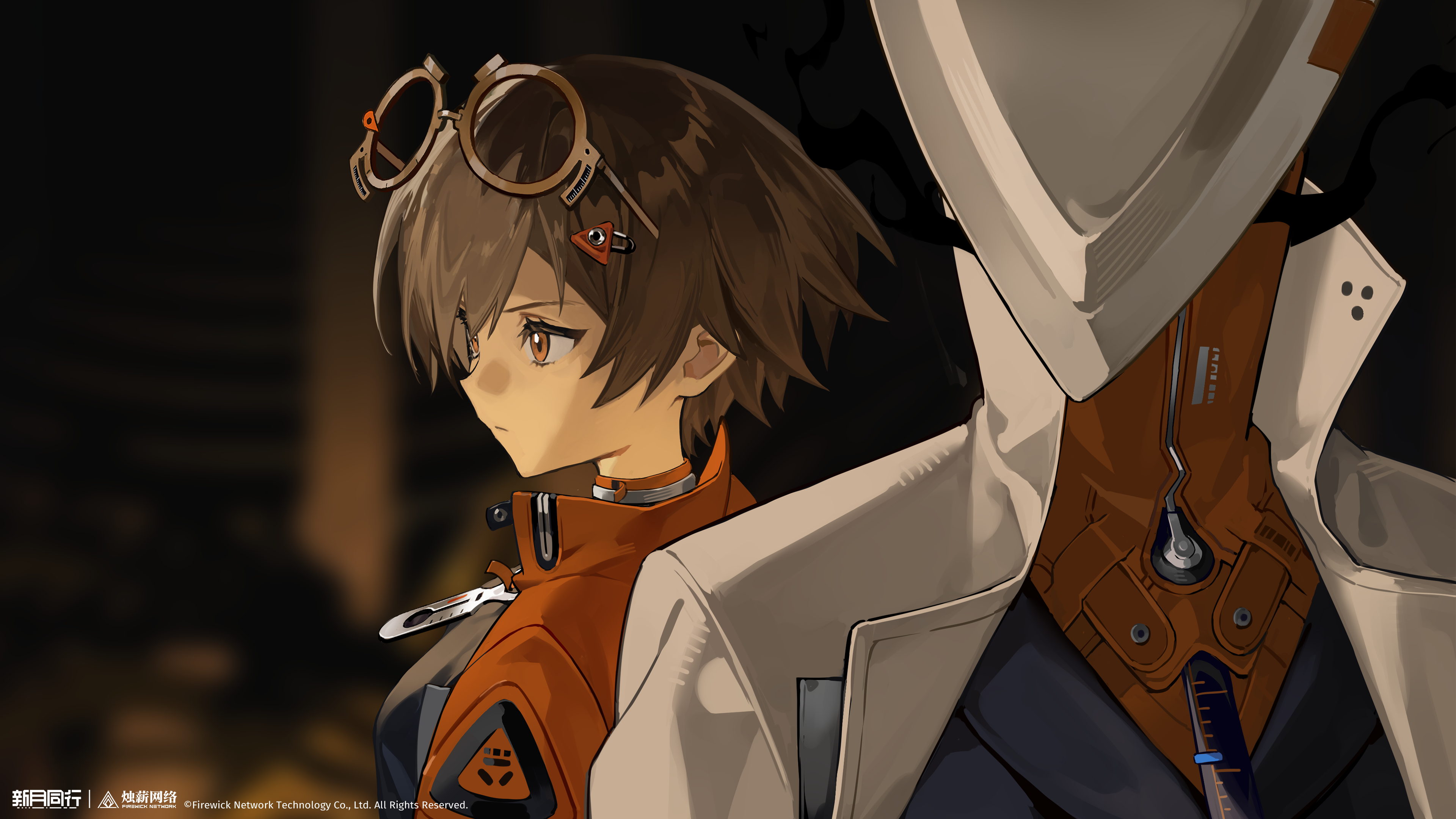 1girl 1other absurdres black_shirt blurry blurry_background brown_hair closed_mouth coat copyright_name copyright_notice dark_background eyewear_on_head from_side glasses group_leader_(xinyue_tongxing) hat highres jacket logo official_art official_wallpaper orange_eyes orange_jacket profile qianqiu_(xinyue_tongxing) round_eyewear shirt short_hair upper_body white_coat white_hat xinyue_tongxing