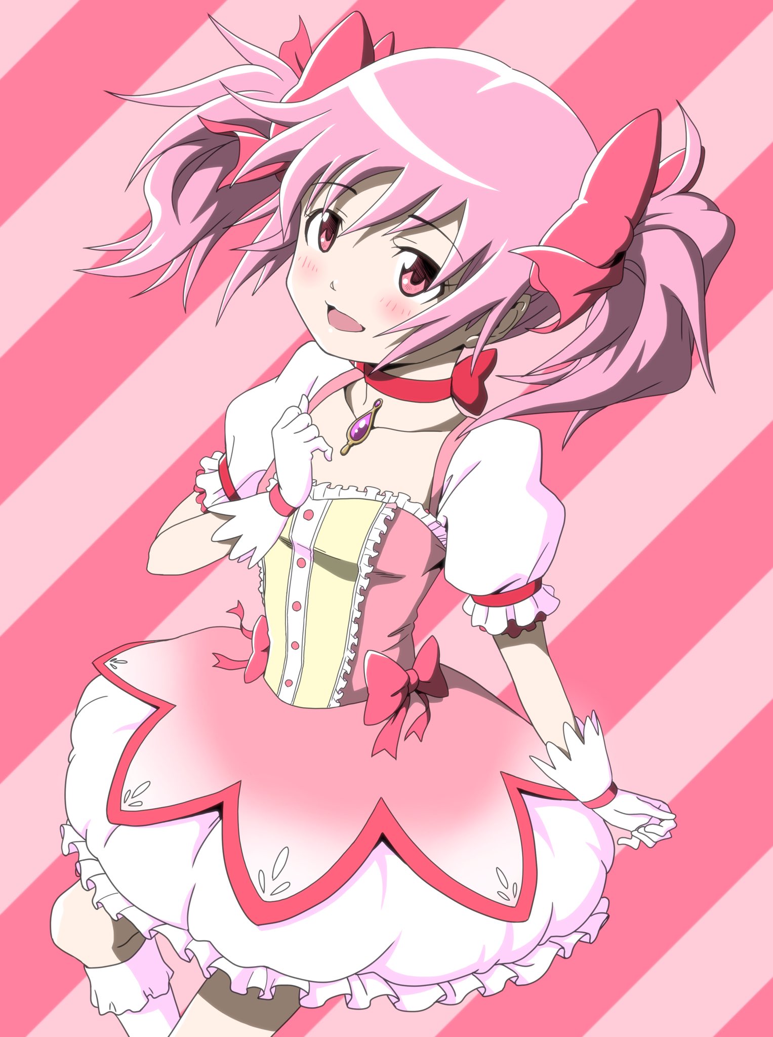 1girl bow breasts child choker commentary_request dress gem hair_bow highres kaname_madoka kaname_madoka_(magical_girl) kneehighs lee_(dragon_garou) mahou_shoujo_madoka_magica mahou_shoujo_madoka_magica_(anime) pink_dress pink_eyes pink_hair puffy_short_sleeves puffy_sleeves red_choker short_sleeves small_breasts socks solo soul_gem white_socks