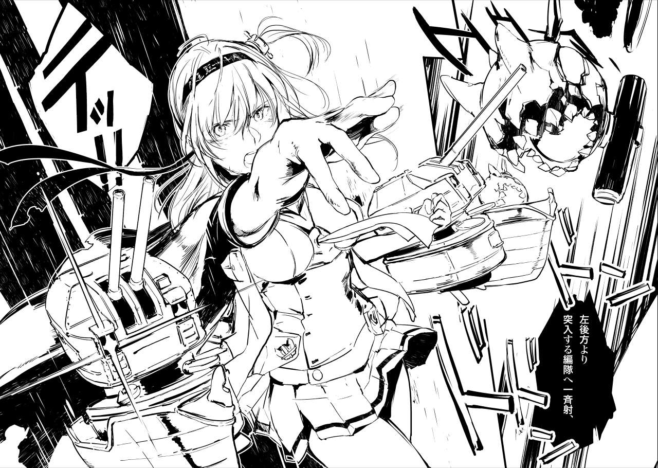 1girl breasts chou-10cm-hou-chan chou-10cm-hou-chan_(suzutsuki's) clothes_writing commentary_request enemy_aircraft_(kancolle) firing greyscale hachimaki hair_between_eyes headband headgear kantai_collection long_hair medium_breasts miniskirt monochrome neckerchief open_mouth outstretched_arm pleated_skirt rigging sailor_collar school_uniform serafuku ship_turret skirt solo sparkle speech_bubble suzutsuki_(kancolle) takeshima_satoshi translation_request
