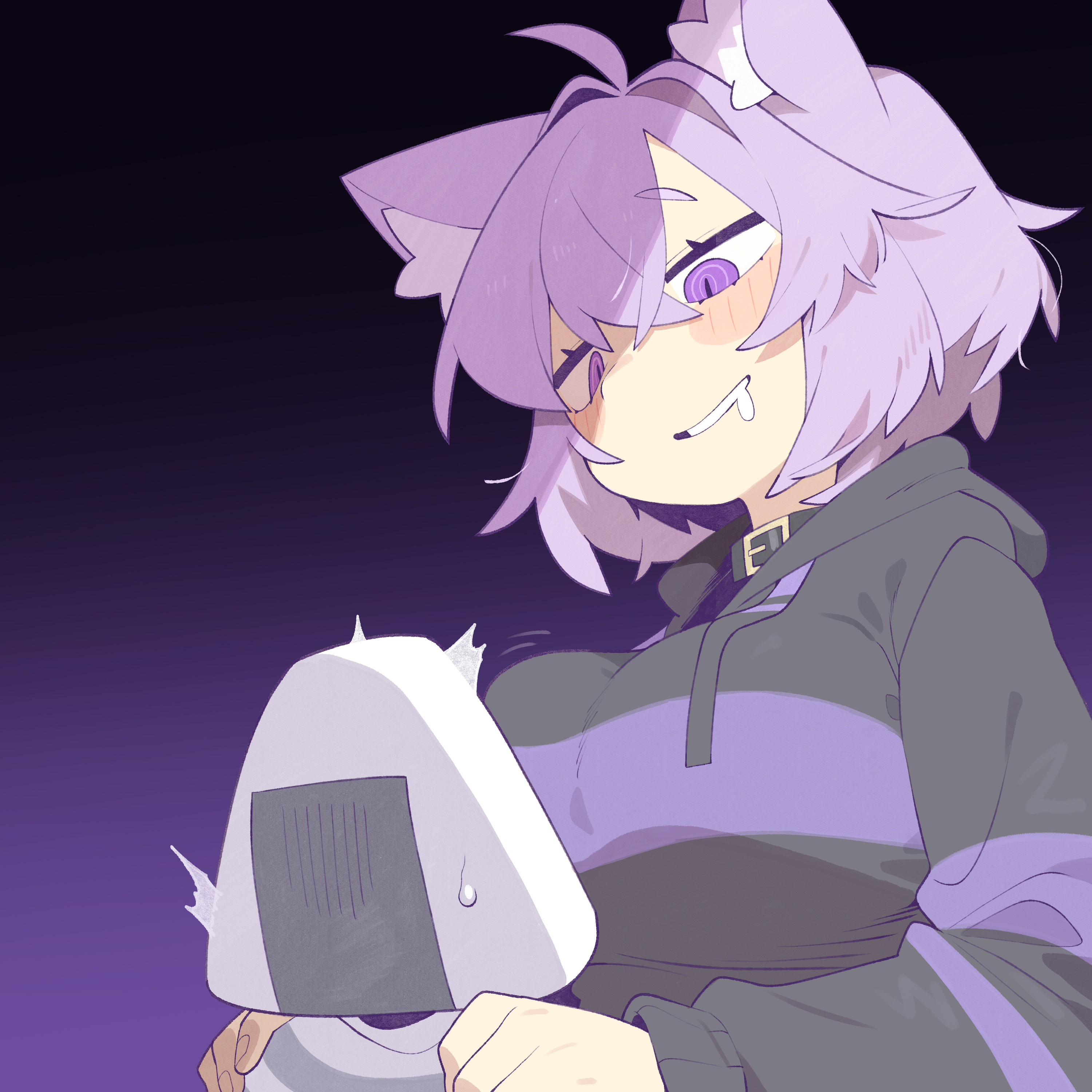 1girl absurdres ahoge animal_ear_fluff animal_ears black_background breasts cocomayo29_(tomato) commentary_request drooling gradient_background hair_between_eyes hands_on_another's_shoulders highres hololive hood hoodie korean_commentary large_breasts long_sleeves looking_at_another nekomata_okayu nekomata_okayu_(1st_costume) nervous_sweating onigirya_(nekomata_okayu) puffy_sleeves purple_background purple_eyes purple_hair purple_hoodie simple_background sweat virtual_youtuber
