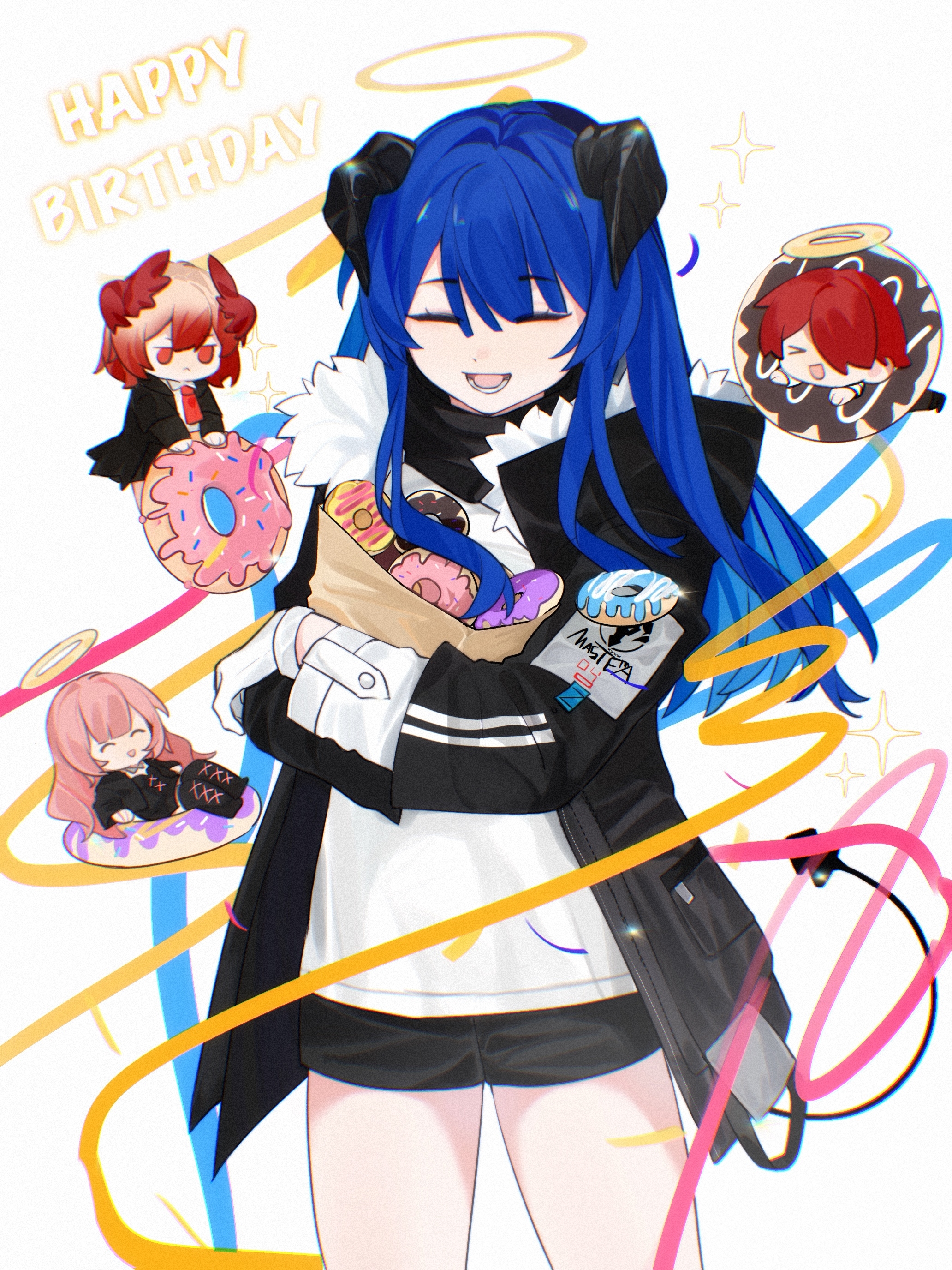 1girl :d ^_^ absurdres arknights bag black_jacket black_shorts chibi chinese_commentary chromatic_aberration closed_eyes commentary_request donut exusiai_(arknights) fiammetta_(arknights) food fur_trim gloves halo happy_birthday highres jacket lemuen_(arknights) long_hair long_sleeves mostima_(arknights) open_clothes open_jacket open_mouth paper_bag purple_hair shirt short_shorts shorts smile solo sparkle standing sui_er_tong traditional_halo white_background white_gloves white_shirt yellow_halo
