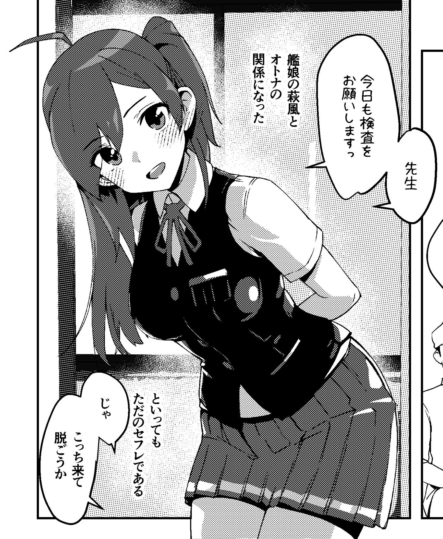 1girl ahoge arms_behind_back asava_(hutaitenn) breasts commentary_request cowboy_shot dress dress_shirt greyscale hagikaze_(kancolle) highres kantai_collection leaning_forward looking_at_viewer medium_breasts monochrome one_side_up pleated_dress shirt smile solo vest