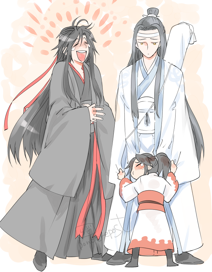 3boys adoptive_parent_and_adoptive_child aged_down ahoge black_boots black_hair black_hanfu blush boots child chinese_clothes closed_eyes closed_mouth clothes_grab coat commentary_request family grey_coat guqin hair_down hair_ribbon half_updo hanfu headband high_ponytail implied_yaoi instrument_case instrument_on_back lan_sizhui lan_sizhui_(young) lan_wangji laughing long_hair long_sleeves looking_at_another looking_down male_focus modao_zushi multiple_boys official_alternate_costume official_alternate_hairstyle open_clothes open_coat open_mouth ponytail red_ribbon red_sash ribbon robe sash shoulder_strap sidelocks smile standing sunmoon9994 tears topknot very_long_hair wangji_guqin watermark wei_wuxian wei_wuxian_(yiling_laozu) white_coat white_hanfu white_headband white_sash wide_sleeves xiao_guan_(headdress) yellow_eyes