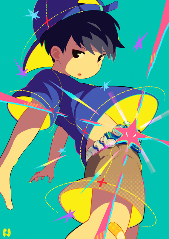 1boy aqua_background backwards_hat bandaid bandaid_on_knee bandaid_on_leg baseball_cap black_eyes black_hair child commentary hat henshin looking_at_viewer male_focus noeyebrow_(mauve) open_mouth original shirt shorts simple_background solo t-shirt
