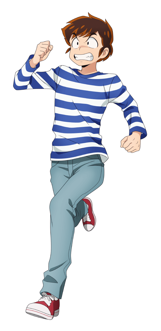 1boy blue_shirt brown_hair clenched_hands clenched_teeth denim highres jeans leg_up male_focus moroboshi_ataru pants running shirt short_hair simple_background solo striped_clothes striped_shirt teeth transparent_background urusei_yatsura v-shaped_eyebrows