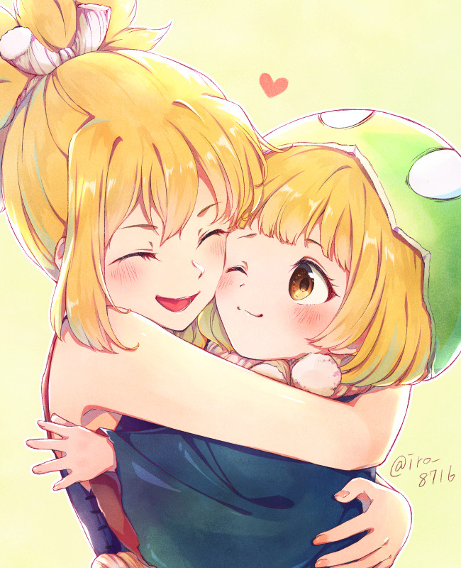 2girls ;) bare_shoulders blonde_hair blunt_bangs blush brown_eyes cheek-to-cheek child closed_eyes closed_mouth commentary_request dr._stone food fruit happy hat heads_together heart high_ponytail hug kohaku_(dr._stone) light_blush looking_at_another multiple_girls one_eye_closed open_mouth pom_pom_(clothes) ponytail short_hair simple_background sleeveless smile suika_(dr.stone) tsukisaka_iro twitter_username upper_body watermelon yellow_background yellow_eyes