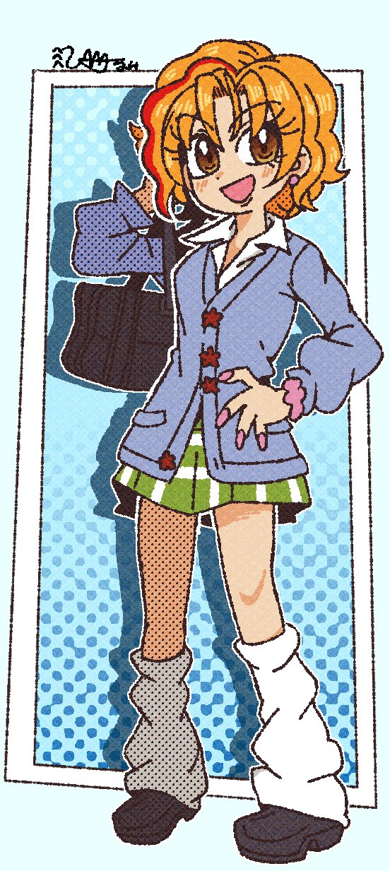 1girl bag black_shoes blue_cardigan brown_eyes cardigan collared_shirt earrings gals! green_skirt gyaru hand_on_own_hip handbag highres jewelry kogal kotobuki_ran long_sleeves looking_at_viewer loose_socks multicolored_hair nail_polish open_mouth orange_hair pink_nails pink_scrunchie ramathal red_hair red_streaks scrunchie shirt shoes short_hair skirt smile socks solo streaked_hair white_shirt white_socks wrist_scrunchie