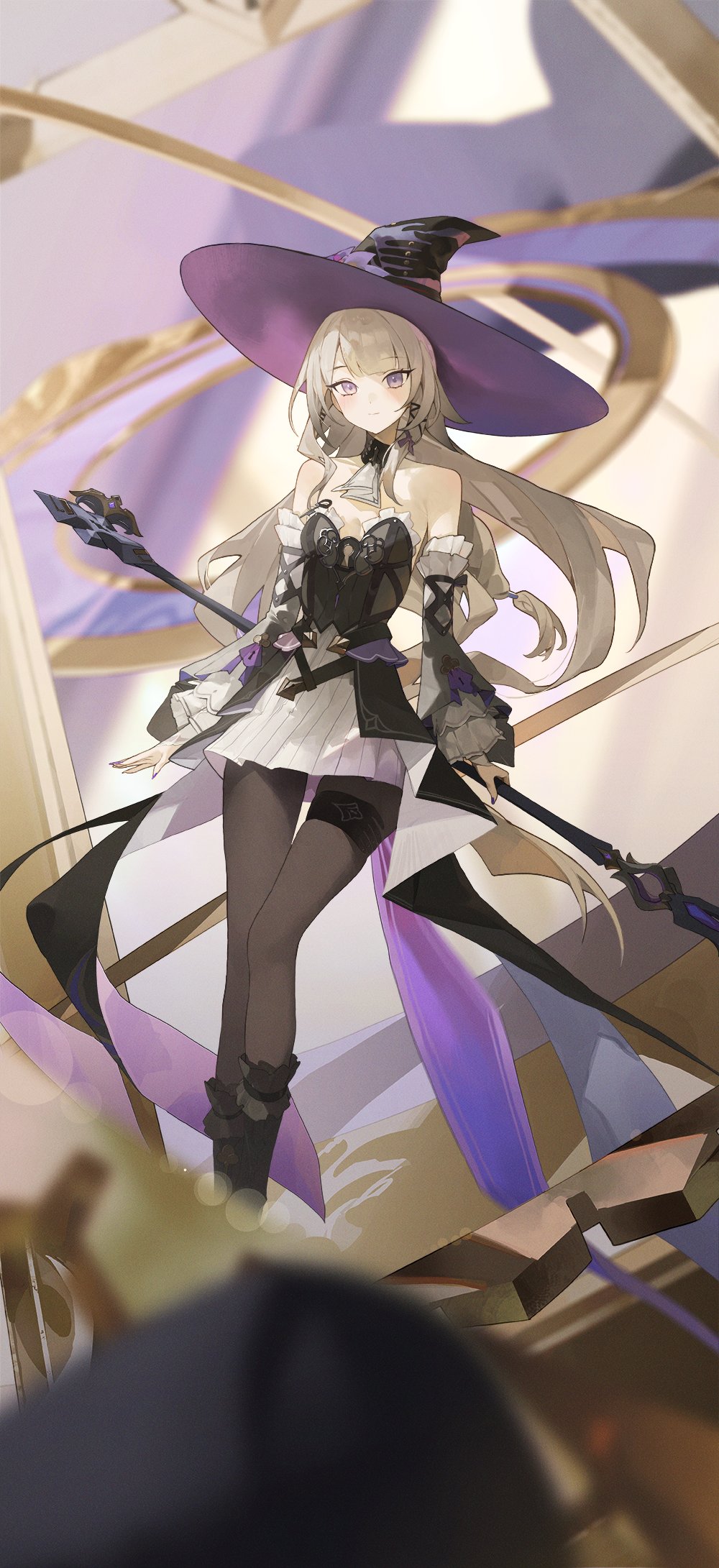 1girl bare_shoulders black_dress black_pantyhose black_sleeves brown_hair detached_collar detached_sleeves dress hat herta_(honkai:_star_rail) highres holding holding_staff honkai:_star_rail honkai_(series) kji_(rozo) layered_dress layered_sleeves long_hair multicolored_dress off-shoulder_dress off_shoulder pantyhose purple_eyes purple_hat solo staff the_herta_(honkai:_star_rail) thigh_strap white_dress witch_hat