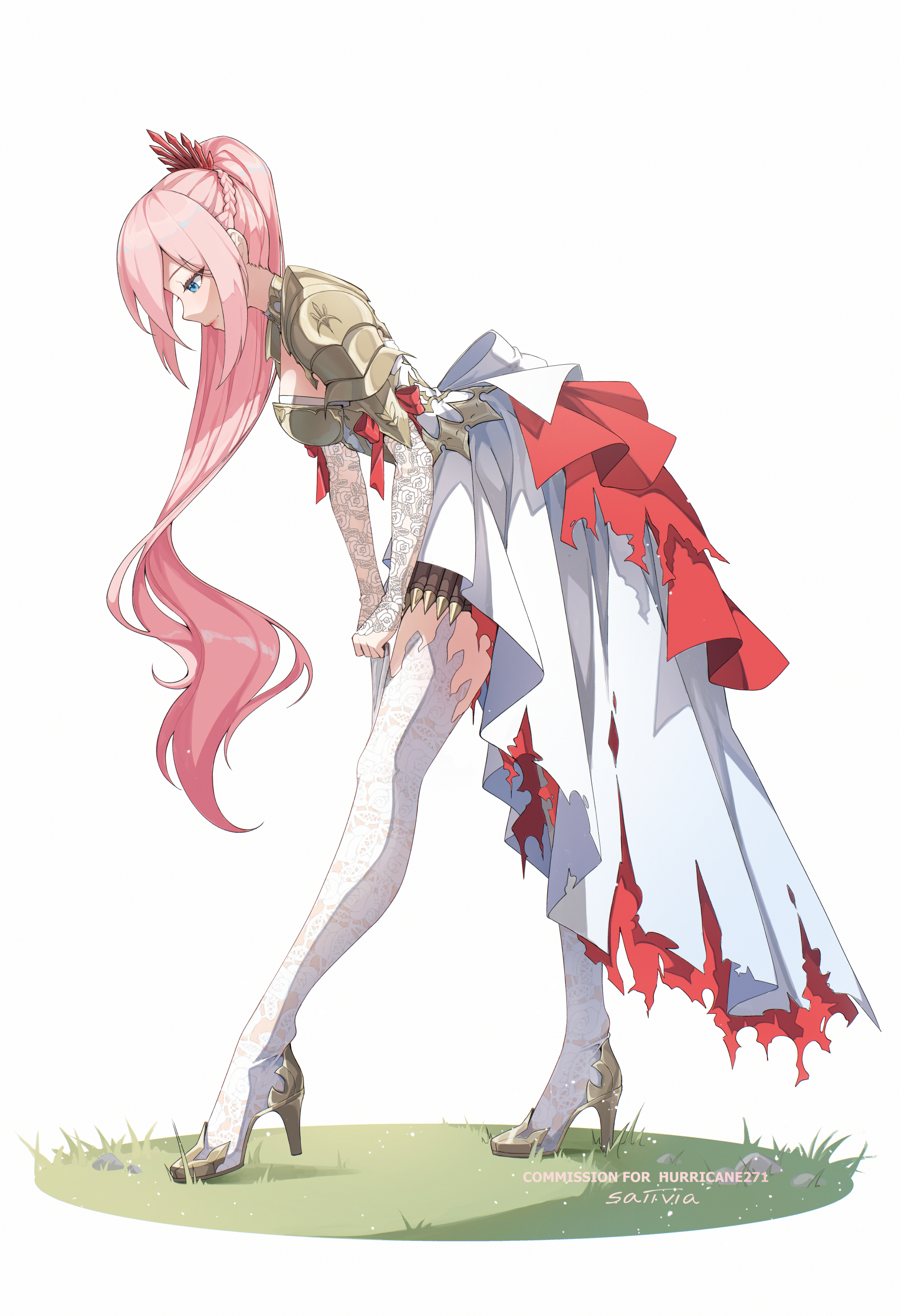 1girl absurdres armor blue_eyes boobplate boots braid breastplate commentary commission dress from_side high_heel_boots high_heels highres long_hair pink_hair ponytail saiivia shionne_(tales) shoulder_armor simple_background solo standing tales_of_(series) tales_of_arise thigh_boots white_background white_boots white_dress