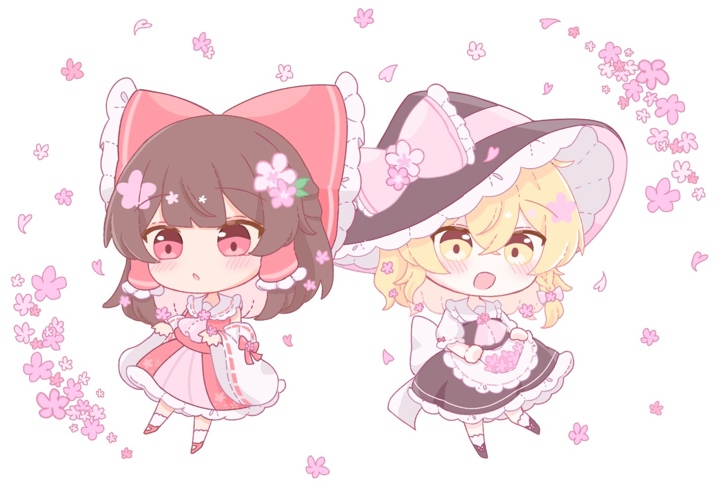 2girls ascot black_hat black_skirt black_vest blonde_hair blush bow braid brown_hair cherry_blossoms chibi chibi_only commentary detached_sleeves flower frilled_bow frilled_hair_tubes frills hair_bow hair_flower hair_ornament hair_tubes hakurei_reimu hat hat_bow kirisame_marisa long_hair multiple_girls open_mouth pink_bow pink_flower red_bow red_eyes red_skirt ribbon-trimmed_sleeves ribbon_trim side_braid single_braid skirt smile touhou vest witch_hat yamutarou yellow_eyes