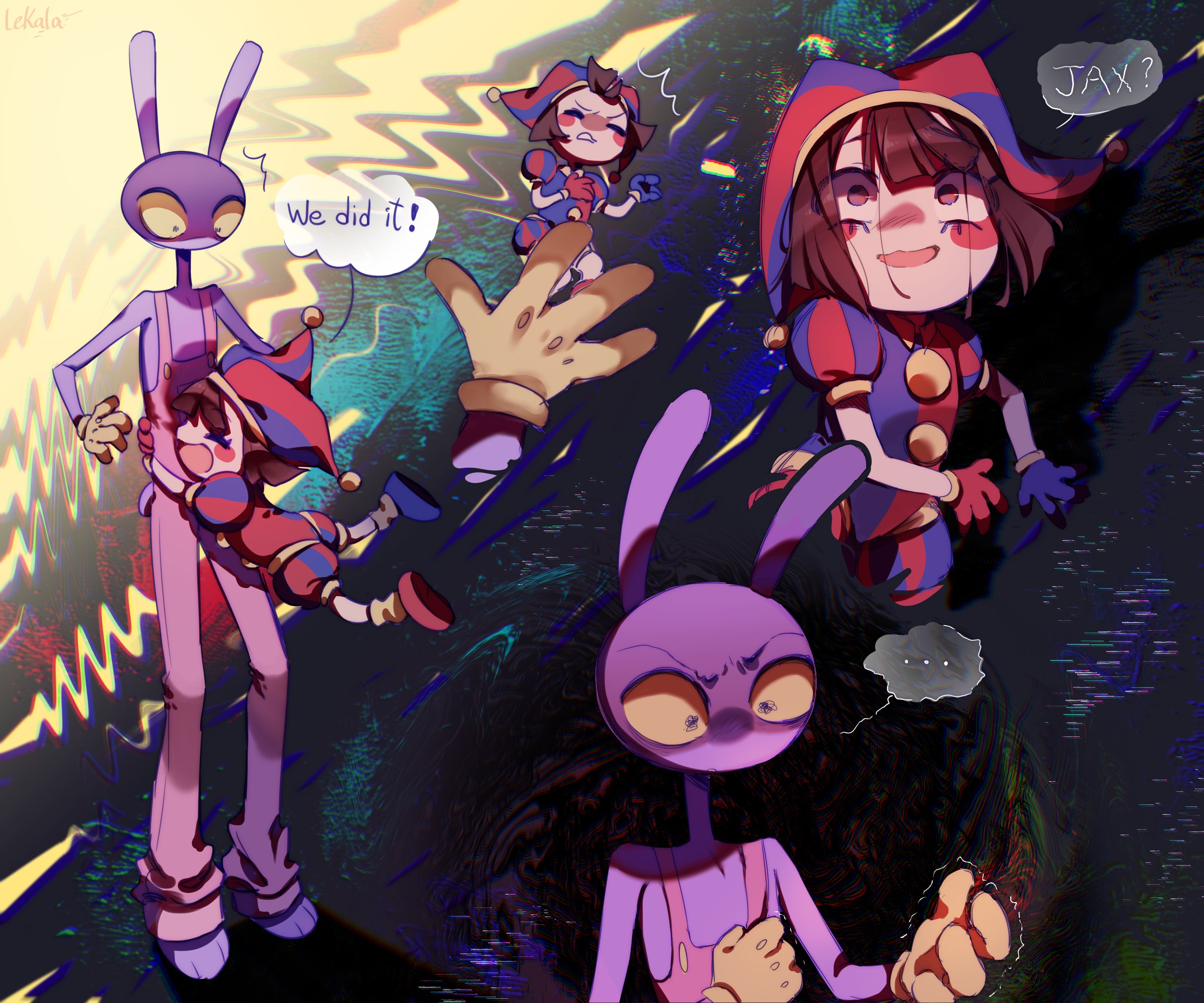 ... 1boy 1girl absurdres animal_ears asymmetrical_gloves blue_gloves blue_hat blush_stickers brown_hair colored_sclera colored_skin commentary english_text furry furry_male gloves hat highres hug jax_(the_amazing_digital_circus) jester_cap lekala mismatched_gloves open_mouth overalls pink_overalls pomni_(the_amazing_digital_circus) puffy_short_sleeves puffy_sleeves rabbit_boy rabbit_ears red_gloves red_hat short_hair short_sleeves spoken_ellipsis the_amazing_digital_circus two-tone_hat white_skin yellow_gloves yellow_sclera