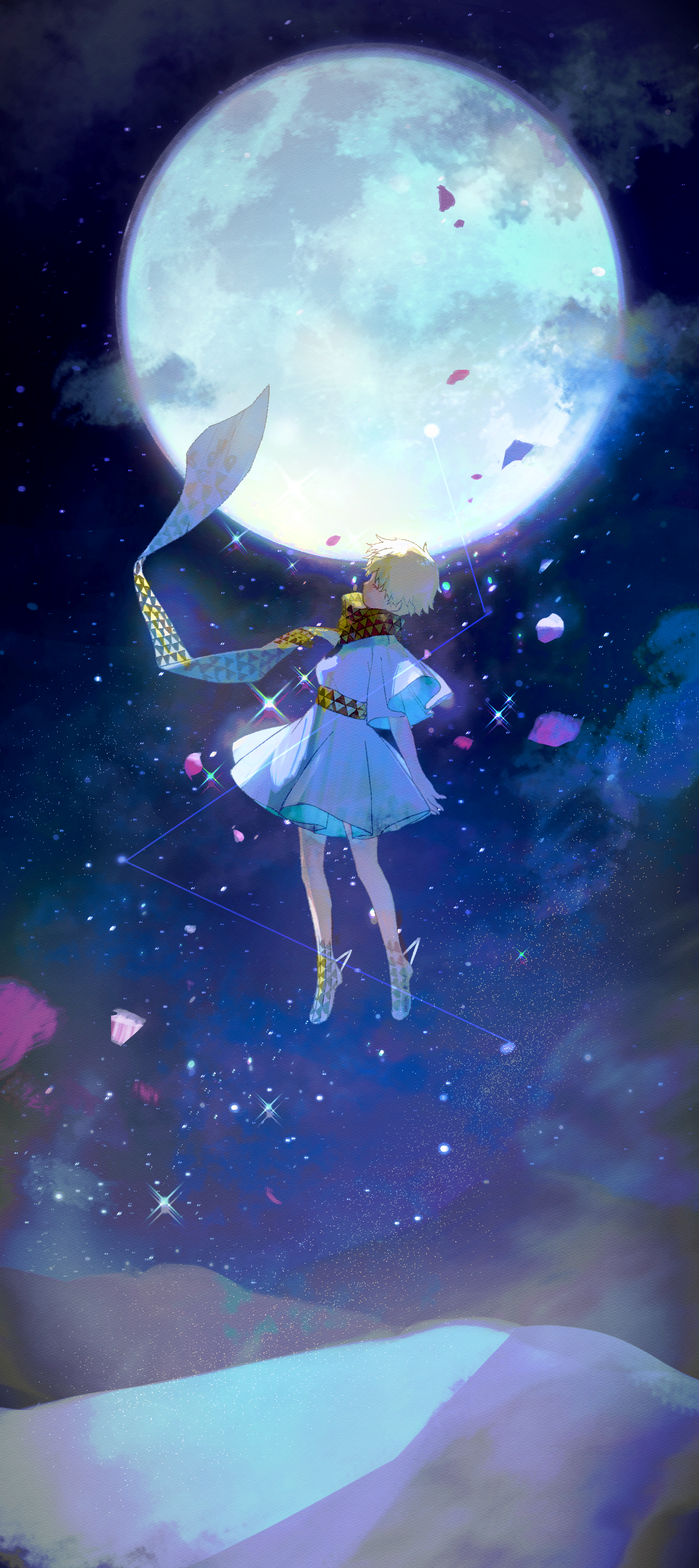 1boy absurdres akibare_(mmpv2224) blonde_hair closed_eyes commentary_request fate_(series) floating highres long_scarf moon night scarf solo sparkle star_(sky) voyager_(fate)