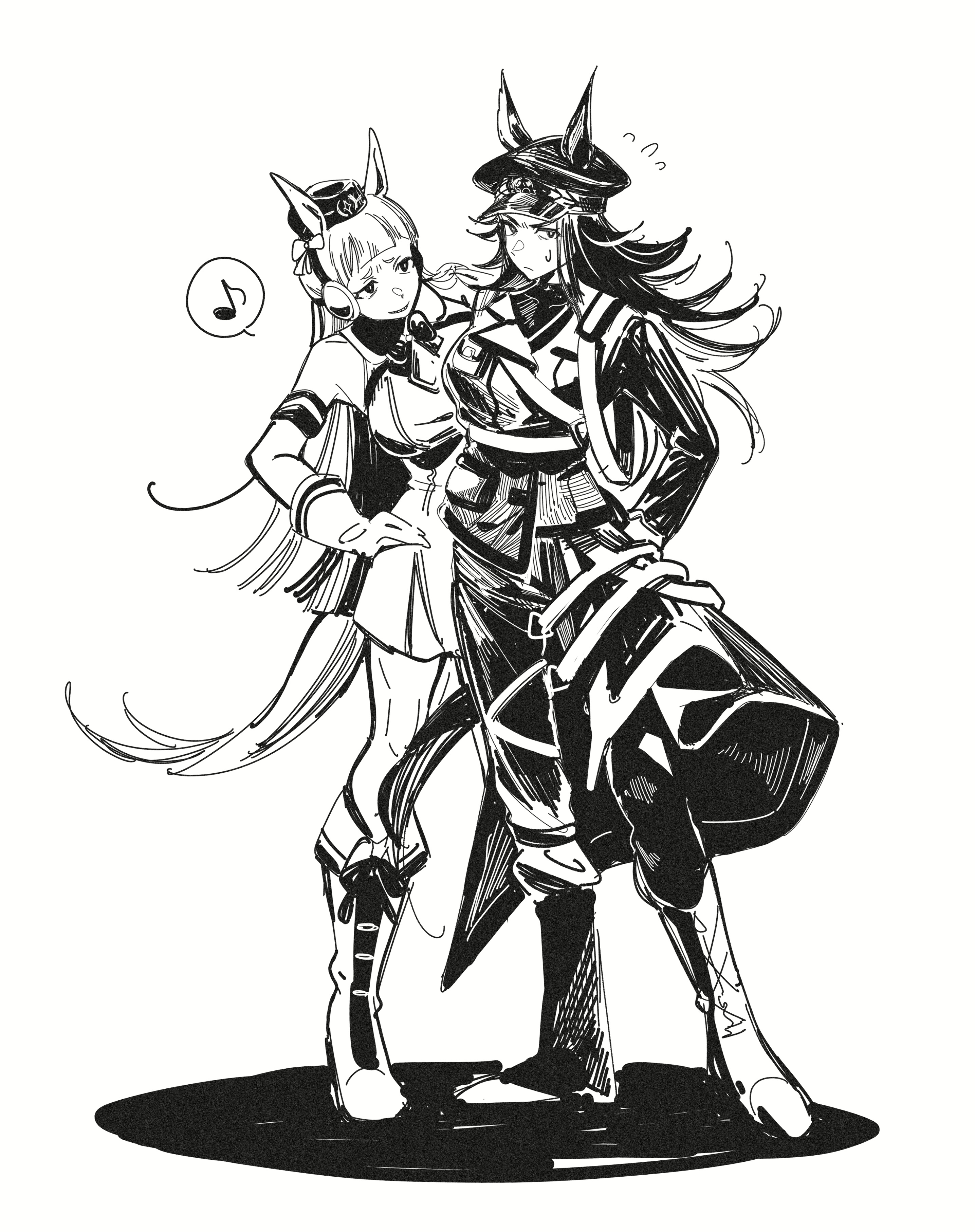2girls absurdres animal_ears armband blunt_bangs boots bow bowtie breasts closed_mouth coat commentary_request dress ear_bow ears_through_headwear fenomeno_(black_flames_of_the_righteous_spirit)_(umamusume) fenomeno_(umamusume) flipped_hair frown gloves gold_ship_(red_strife)_(umamusume) gold_ship_(umamusume) greyscale hat highres horse_ears horse_girl horse_tail horseshoe_hat_ornament horseshoe_ornament jacket long_hair long_sleeves medium_breasts monochrome multiple_girls musical_note ohayonabeno pants pantyhose peaked_cap pillbox_hat shirt simple_background sleeveless sleeveless_dress smile speech_bubble spoken_musical_note striped_armband striped_clothes sweatdrop tail umamusume white_background