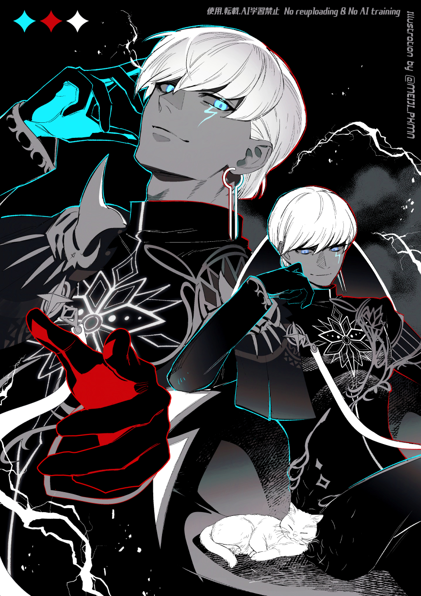 1boy black_shirt blue_eyes cat closed_mouth crossed_legs fate/grand_order fate_(series) highres indra_(fate) looking_at_viewer meiji_ken multiple_views shirt short_hair sitting twitter_username watermark white_hair