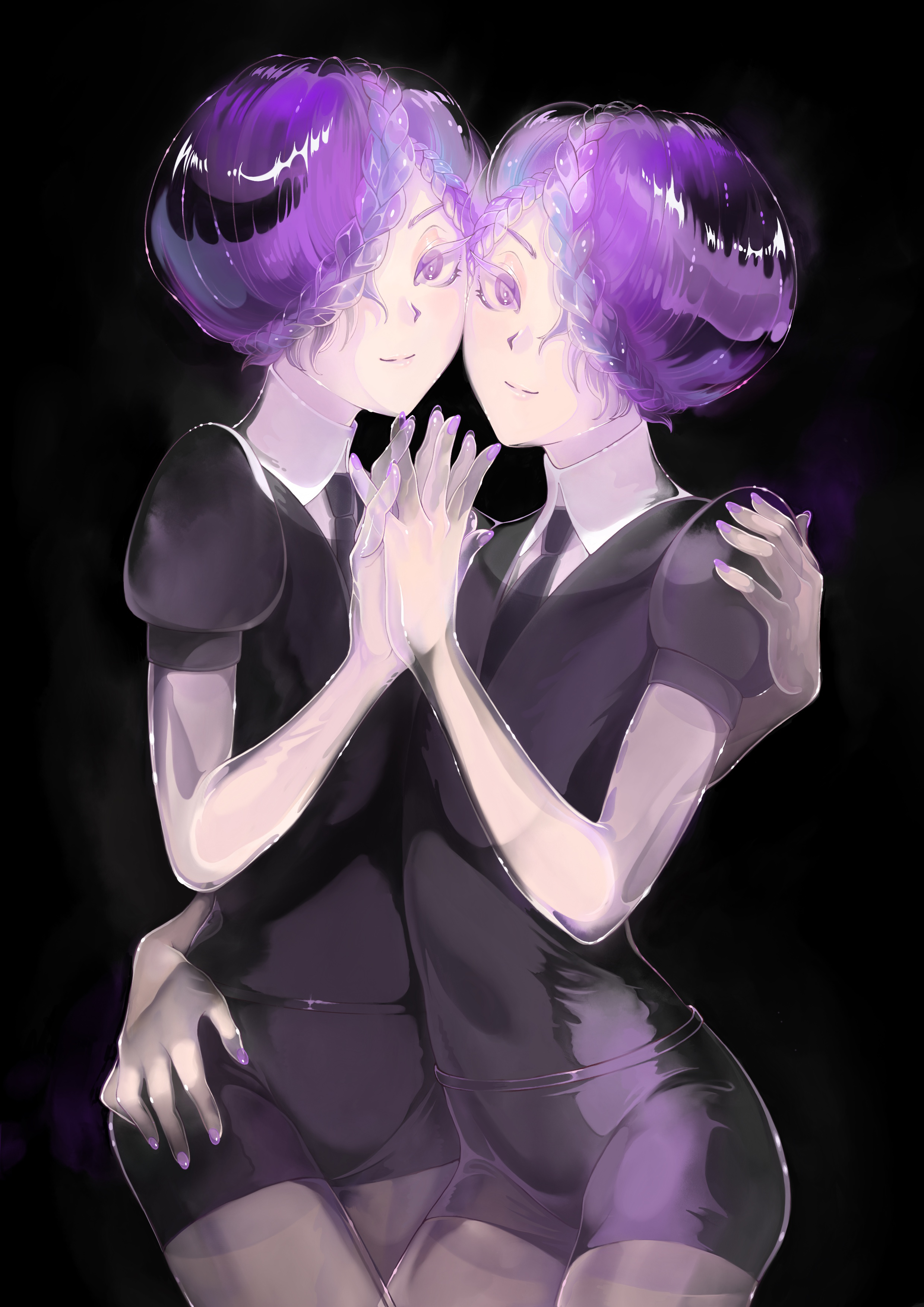 2others absurdres amethyst_(houseki_no_kuni) androgynous braid collared_shirt colored_eyelashes commentary gem_uniform_(houseki_no_kuni) hair_over_one_eye highres houseki_no_kuni multiple_others necktie oo0mog0oo purple_hair purple_nails shirt siblings
