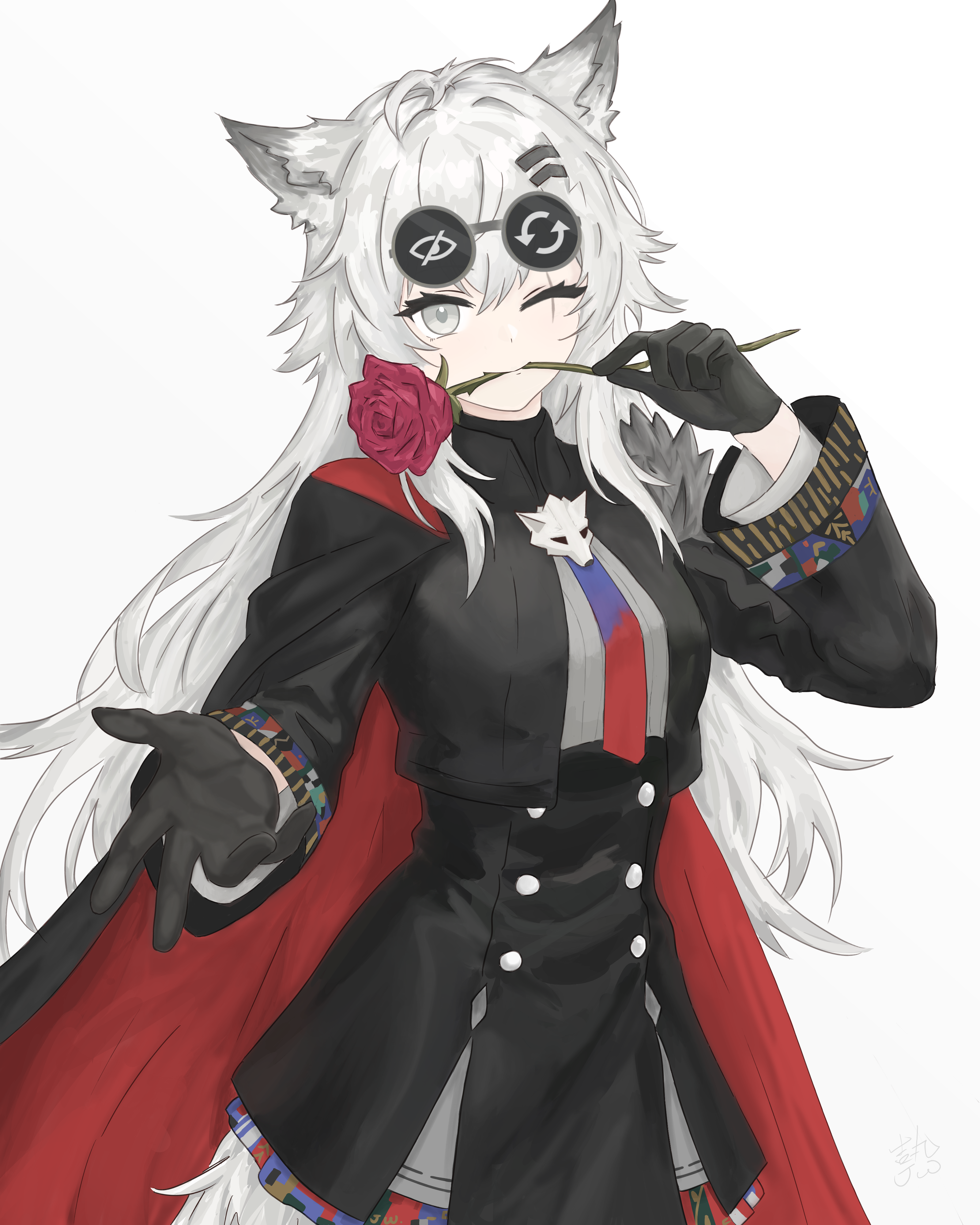 1girl ;) absurdres animal_ears arknights black_cape black_gloves black_jacket black_skirt bolo_tie cape closed_mouth commentary cowboy_shot english_commentary flower gloves gradient_background grey_eyes hair_ornament hairclip highres jacket ji_wan_2 lappland_(arknights) lappland_the_decadenza_(arknights) long_hair long_sleeves looking_at_viewer one_eye_closed outstretched_hand pink_flower pink_rose red_cape rose round_eyewear scar scar_across_eye scar_on_face secretary_settings_(arknights) skirt smile solo standing sunglasses two-sided_cape two-sided_fabric variant_set white_background white_hair wolf_ears wolf_girl