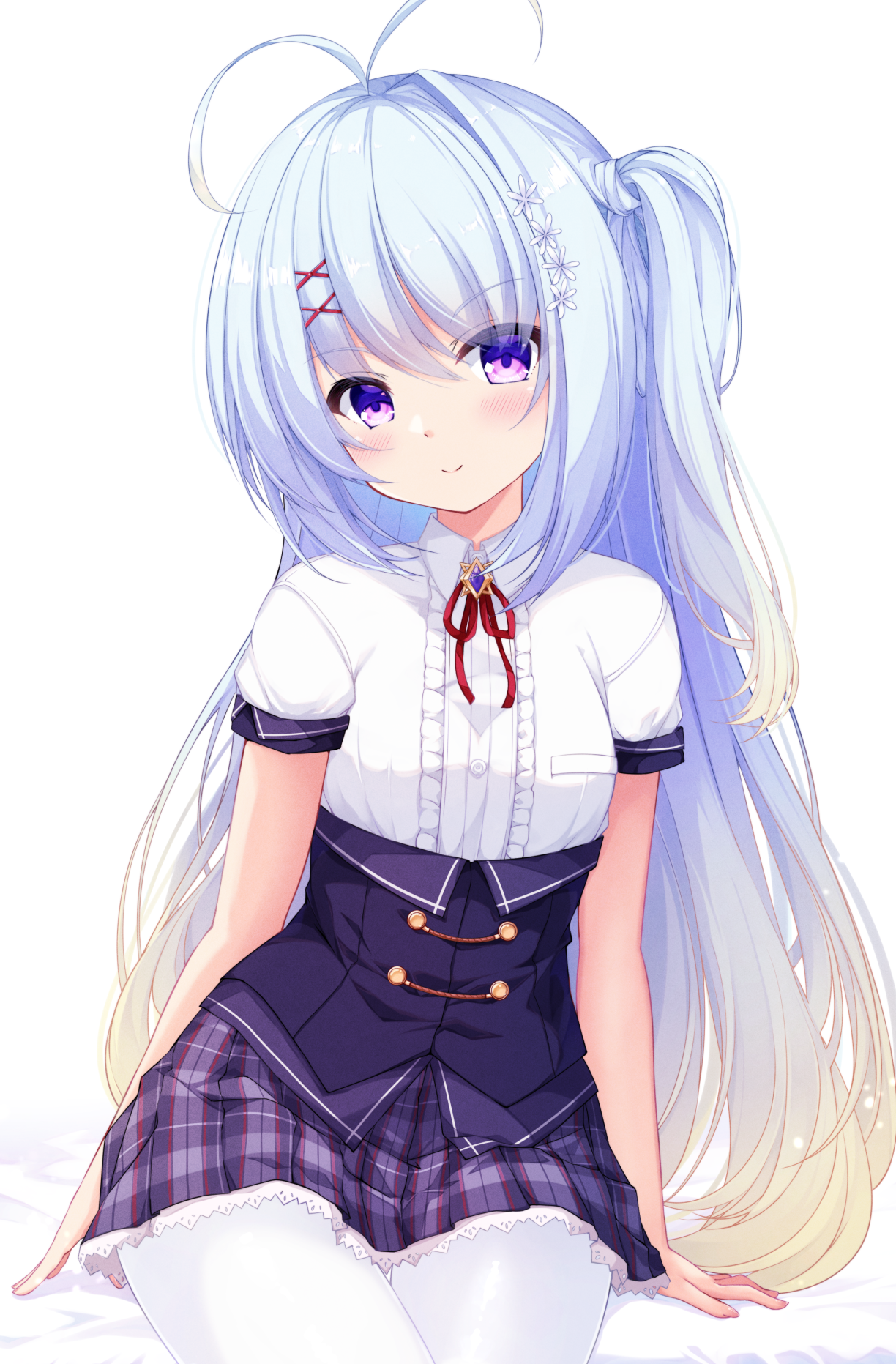 1girl antenna_hair bed_sheet blue_hair breasts brown_hair center_frills closed_mouth collared_shirt commentary_request dress_shirt flower frills fuuna gradient_hair hair_flower hair_ornament head_tilt highres long_hair looking_at_viewer lucia_valignano multicolored_hair neck_ribbon one_side_up pantyhose plaid_clothes plaid_skirt puffy_short_sleeves puffy_sleeves purple_eyes purple_skirt red_ribbon ribbon shirt short_sleeves simple_background single_hair_intake sitting skirt small_breasts smile solo unless_terminalia very_long_hair white_background white_flower white_pantyhose white_shirt x_hair_ornament