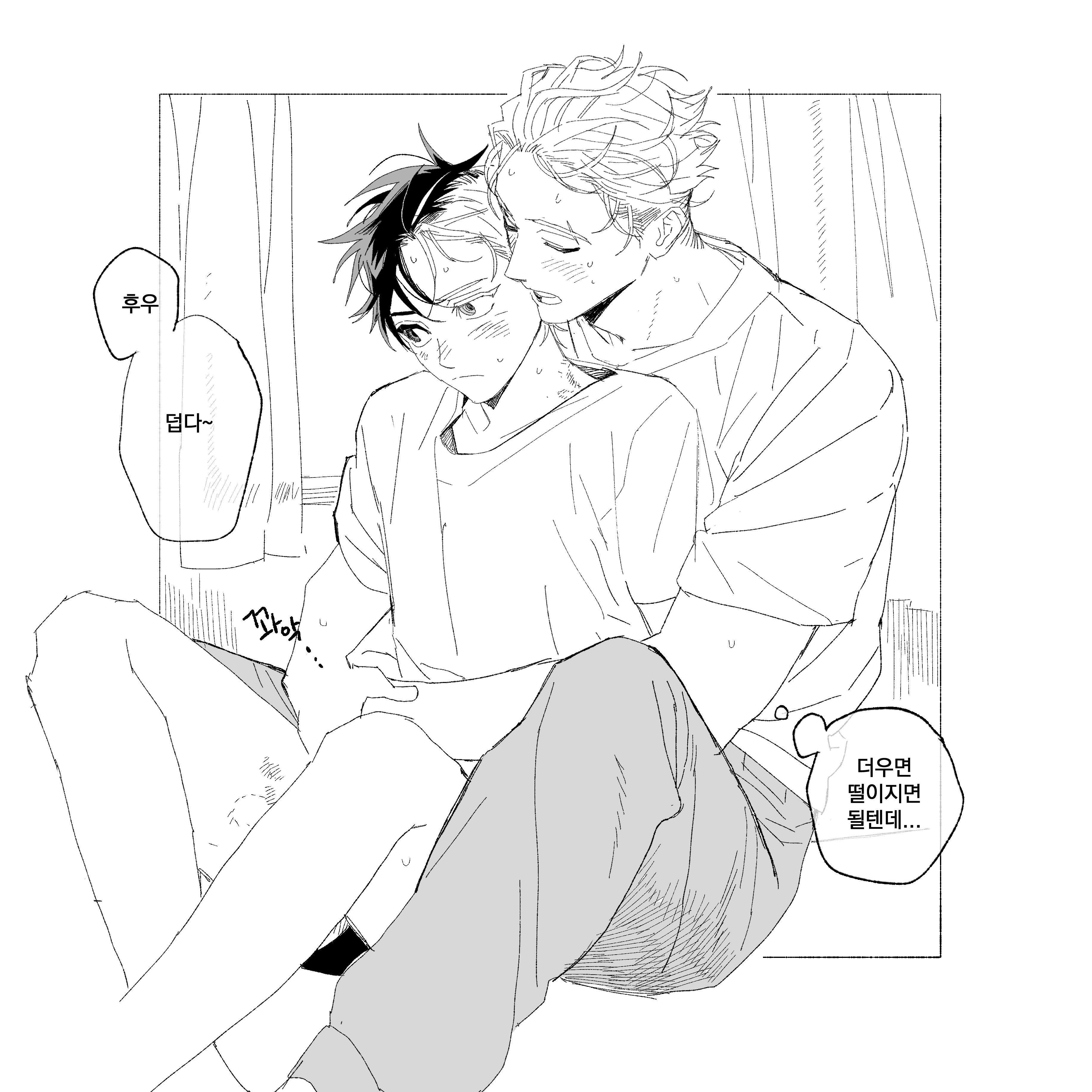 2boys absurdres arms_around_another's_waist blush closed_eyes commentary_request crew_neck curtains greyscale highres indoors korean_commentary looking_to_the_side male_focus monochrome multicolored_hair multiple_boys open_mouth pants pd_honey sakura_haruka_(wind_breaker) shirt short_sleeves sideways_glance sitting speech_bubble split-color_hair thought_bubble translation_request umemiya_hajime wind_breaker_(nii_satoru) window yaoi